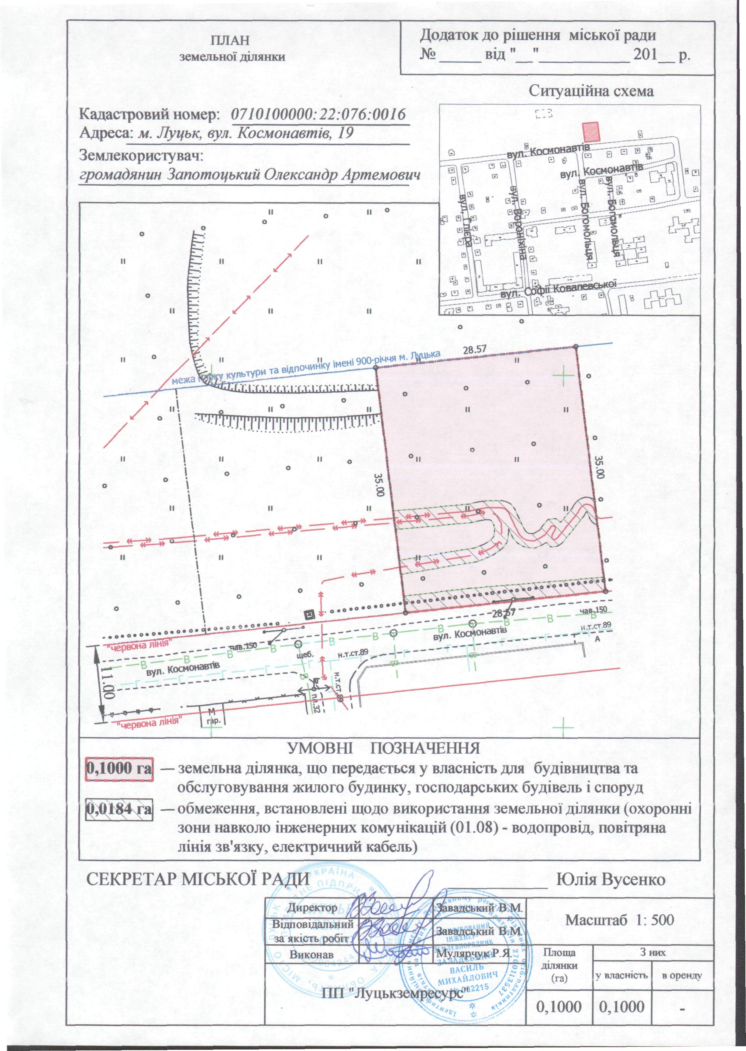 2. Передати громадянину Запотоцькому Олександру Артемовичу безоплатно у власність земельну ділянку на вул. Космонавтів, 19 площею 0,1000 га, кадастровим номером 0710100000:22:076:0016 для будівництва та обслуговування жилого будинку, господарських будівель і споруд, згідно з додатком.