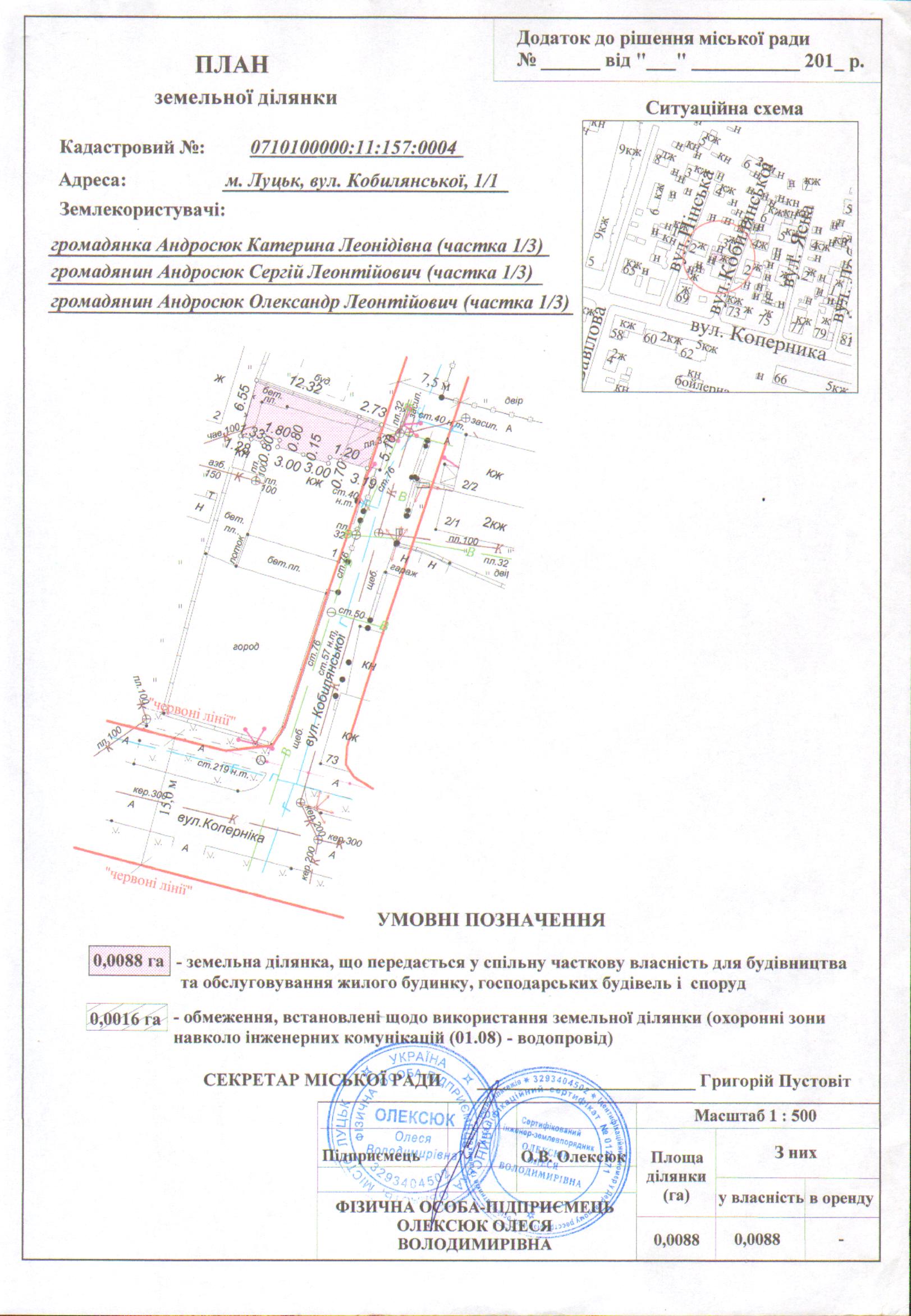 2. Передати громадянам Андросюк Катерині Леонідівні (частка 1/3), Андросюку Сергію Леонтійовичу (частка 1/3), Андросюку Олександру Леонтійовичу (частка 1/3) безоплатно у спільну часткову власність земельну ділянку на вул. Кобилянської, 1/1 площею 0,0088 га, кадастровим номером 0710100000:11:157:0004 для будівництва та обслуговування жилого будинку, господарських будівель і споруд, згідно з додатком.