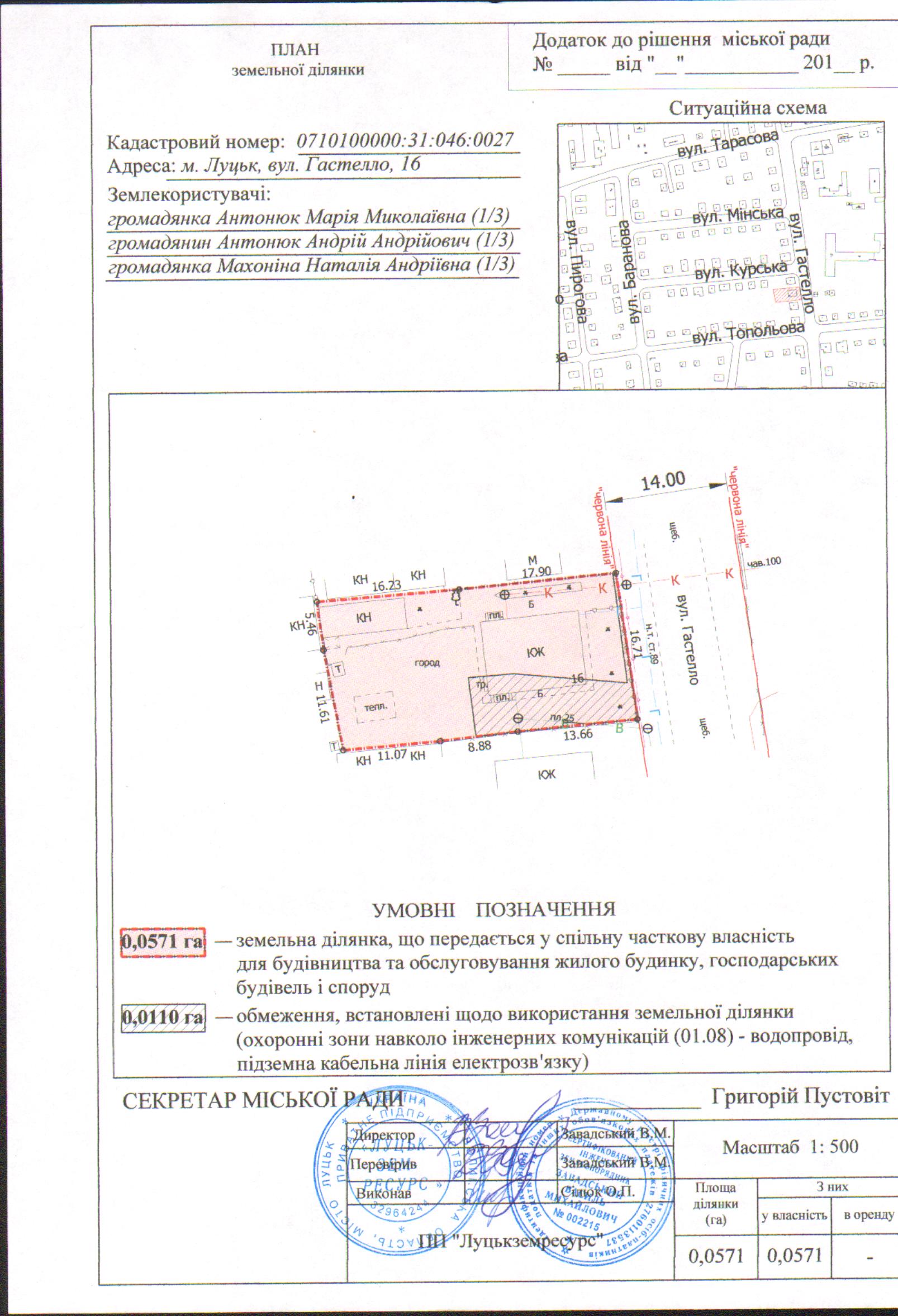 2. Передати громадянам Антонюк Марії Миколаївні (частка 1/3), Антонюку Андрію Андрійовичу (частка 1/3), Махоніній Наталії Андріївні (частка 1/3) безоплатно у спільну часткову власність земельну ділянку на вул. Гастелло, 16 площею 0,0571 га, кадастровим номером 0710100000:31:046:0027 для будівництва та обслуговування жилого будинку, господарських будівель і споруд, згідно з додатком.