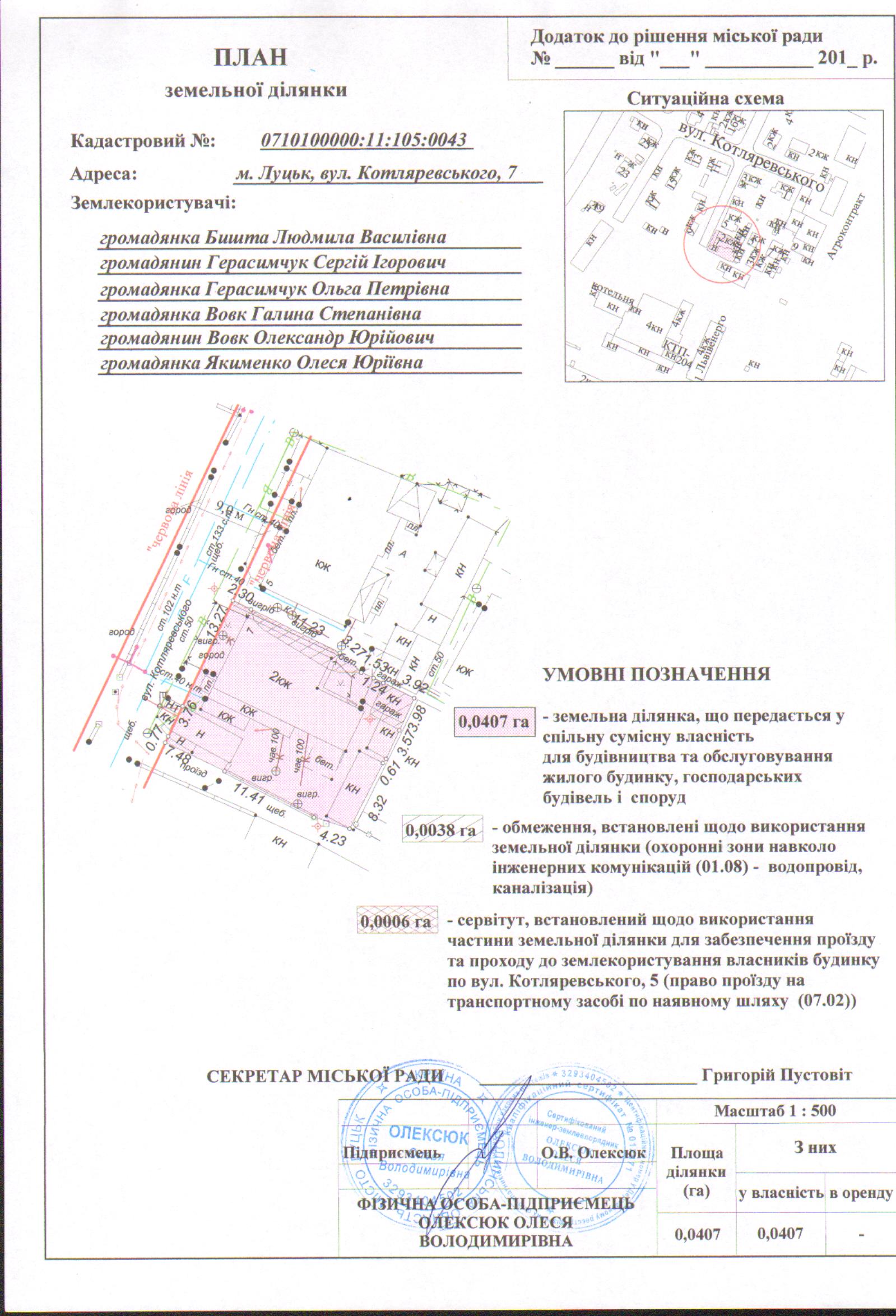 2. Передати громадянам Бишті Людмилі Василівні, Герасимчуку Сергію Ігоровичу, Герасимчук Ользі Петрівні, Вовк Галині Степанівні, Вовку Олександру Юрійовичу, Якименко Олесі Юріївні безоплатно у спільну сумісну власність земельну ділянку на вул. Котляревського, 7 площею 0,0407 га, кадастровим номером 0710100000:11:105:0043 для будівництва та обслуговування жилого будинку, господарських будівель і споруд, згідно з додатком.