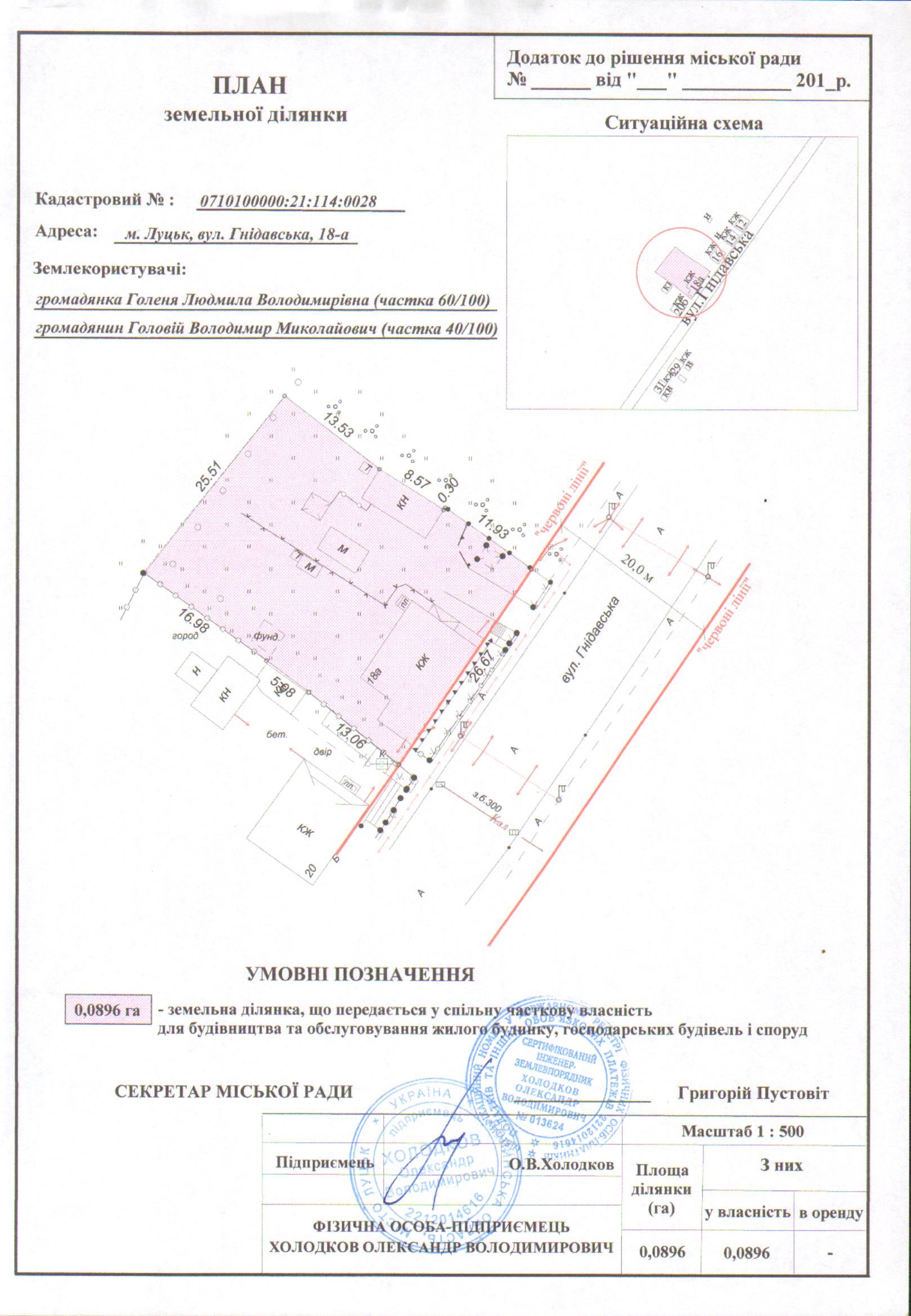 2. Передати громадянам Голені Людмилі Володимирівні (частка 60/100), Головію Володимиру Миколайовичу (частка 40/100) безоплатно у спільну часткову власність земельну ділянку на вул. Гнідавській, 18-а площею 0,0896 га, кадастровим номером 0710100000:21:114:0028 для будівництва та обслуговування жилого будинку, господарських будівель і споруд, згідно з додатком.