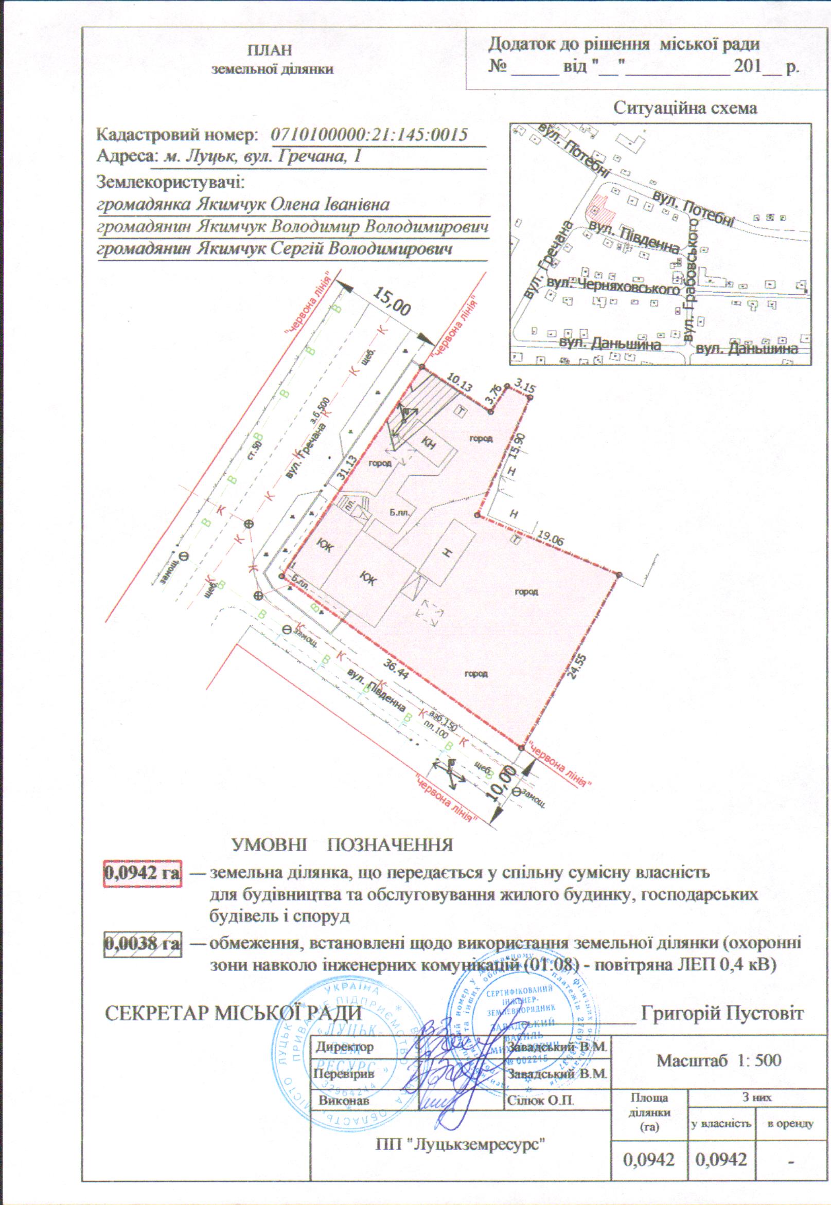 1. Затвердити громадянам Якимчук Олені Іванівні, Якимчуку Володимиру Володимировичу, Якимчуку Сергію Володимировичу технічну документацію із землеустрою щодо встановлення (відновлення) меж земельної ділянки в натурі (на місцевості) на вул. Гречаній, 1 площею 0,0942 га, кадастровим номером 0710100000:21:145:0015 для будівництва та обслуговування жилого будинку, господарських будівель і споруд.