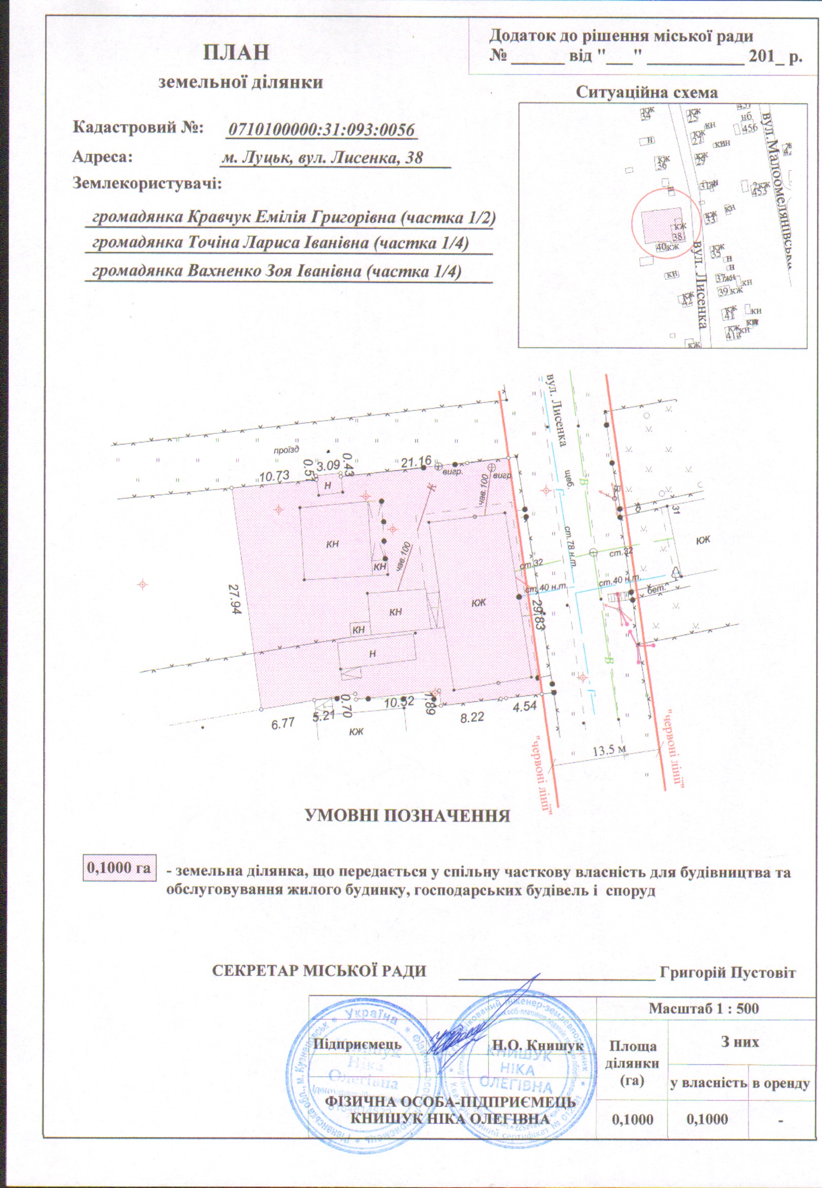 1. Затвердити громадянам Кравчук Емілії Григорівні (частка 1/2), Точіній Ларисі Іванівні (частка 1/4), Вахненко Зої Іванівні (частка 1/4) технічну документацію із землеустрою щодо встановлення (відновлення) меж земельної ділянки в натурі (на місцевості) на вул. Лисенка, 38 площею 0,1000 га, кадастровим номером 0710100000:31:093:0056 для будівництва та обслуговування жилого будинку, господарських будівель і споруд.