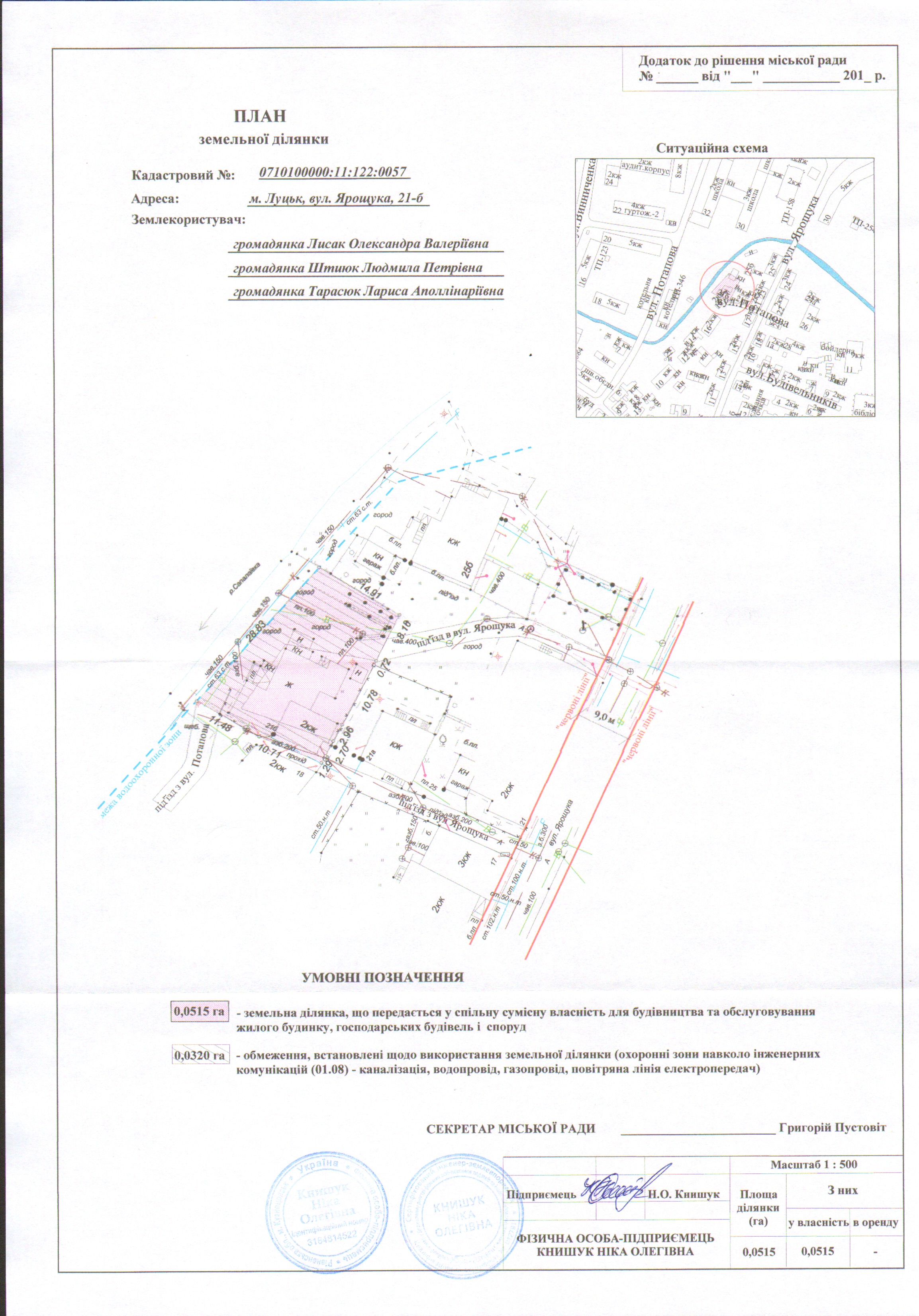 1. Затвердити громадянам Лисак Олександрі Валеріївні, Штиюк Людмилі Петрівні, Тарасюк Ларисі Аполлінаріївні технічну документацію із землеустрою щодо встановлення (відновлення) меж земельної ділянки в натурі (на місцевості) на вул. Ярощука, 21-б площею 0,0515 га, кадастровим номером 0710100000:11:122:0057 для будівництва та обслуговування жилого будинку, господарських будівель і споруд.
