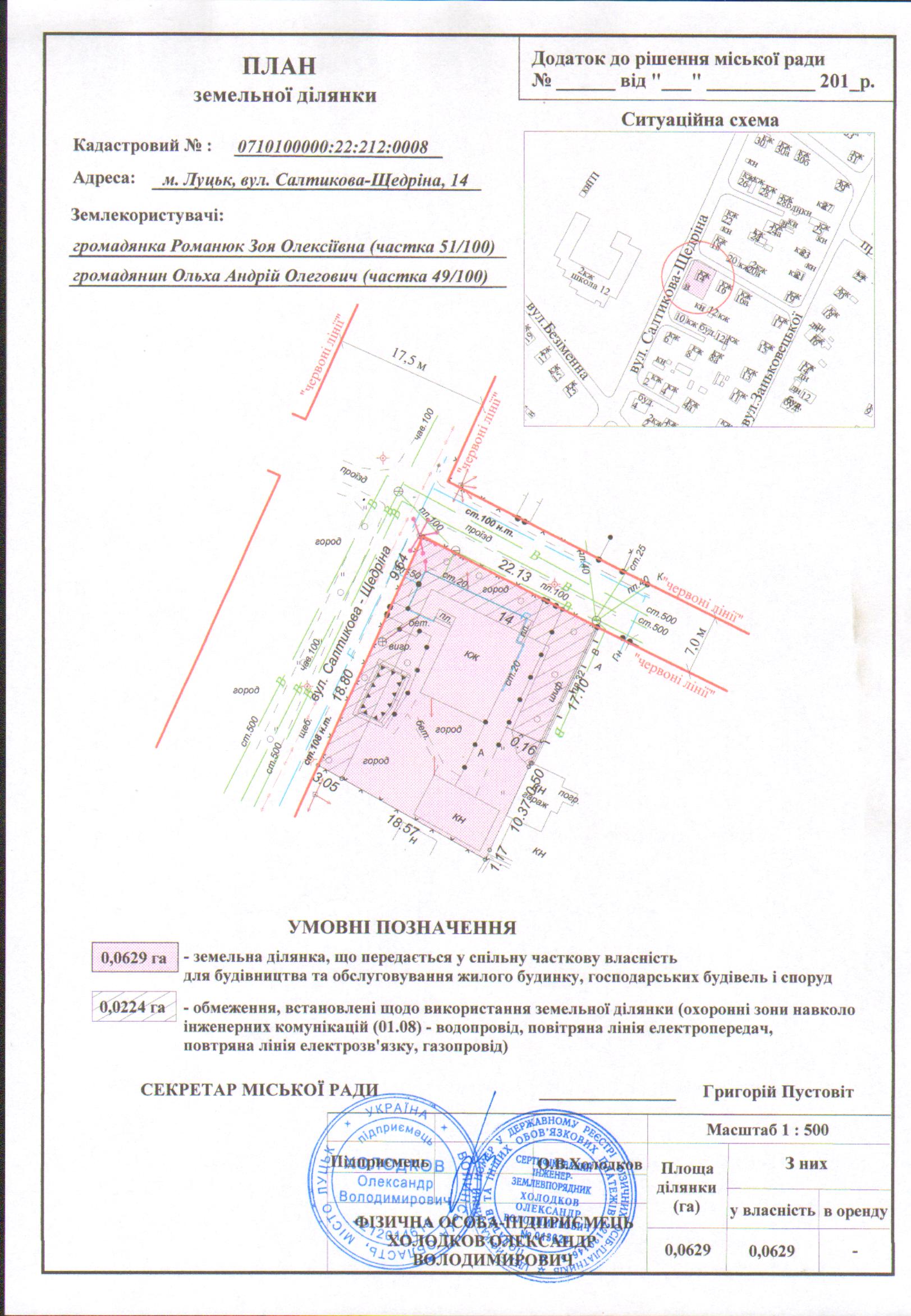 2. Передати громадянам Романюк Зої Олексіївні (частка 51/100), Ольсі Андрію Олеговичу (частка 49/100) безоплатно у спільну часткову власність земельну ділянку на вул. Салтикова-Щедріна, 14 площею 0,0629 га, кадастровим номером 0710100000:22:212:0008 для будівництва та обслуговування жилого будинку, господарських будівель і споруд, згідно з додатком.