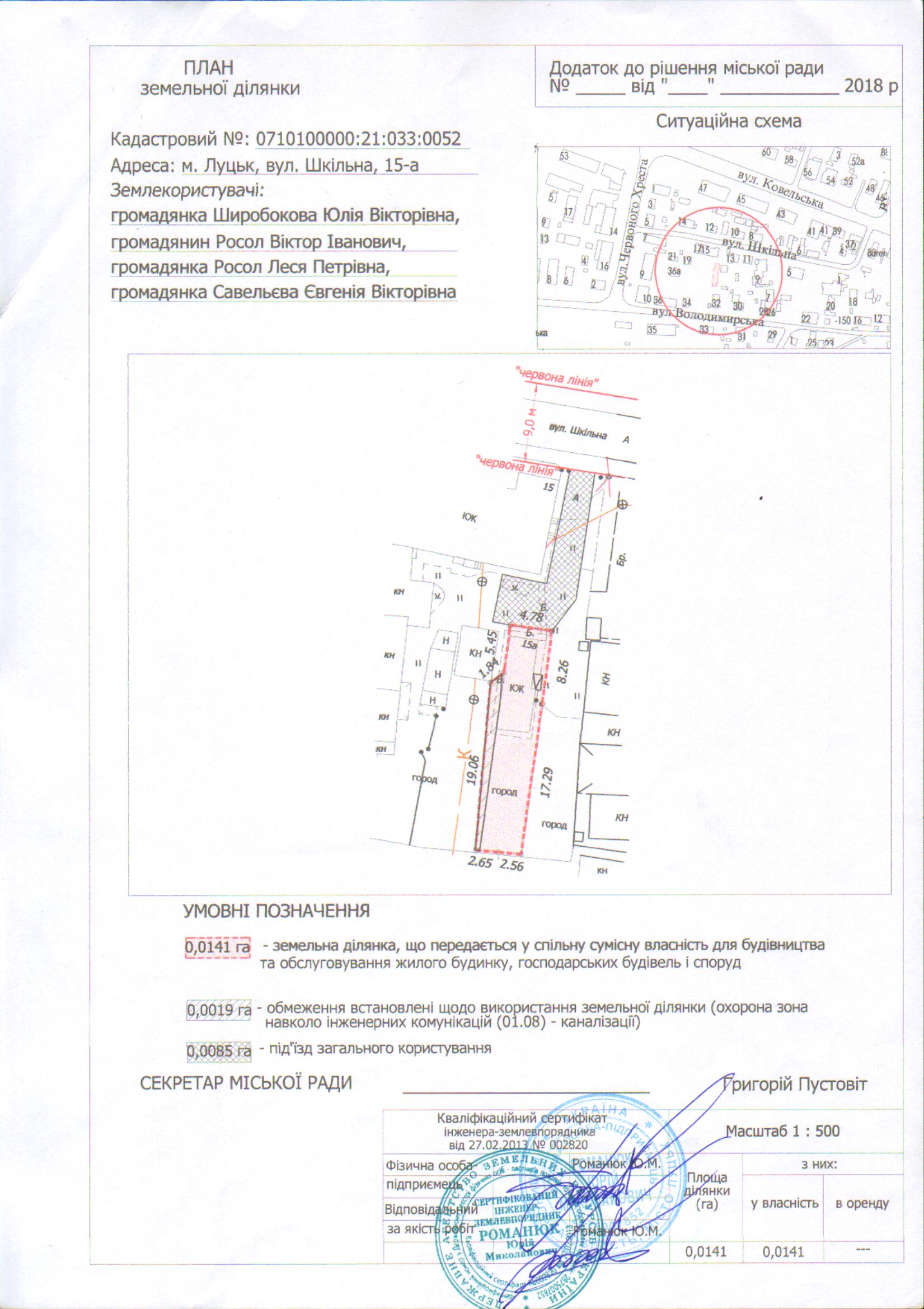 2. Передати громадянам Широбоковій Юлії Вікторівні, Росолу Віктору Івановичу, Росол Лесі Петрівні, Савельєвій Євгенії Вікторівні безоплатно у спільну сумісну власність земельну ділянку на вул. Шкільній, 15-а площею 0,0141 га, кадастровим номером 0710100000:21:033:0052 для будівництва та обслуговування жилого будинку, господарських будівель і споруд, згідно з додатком.