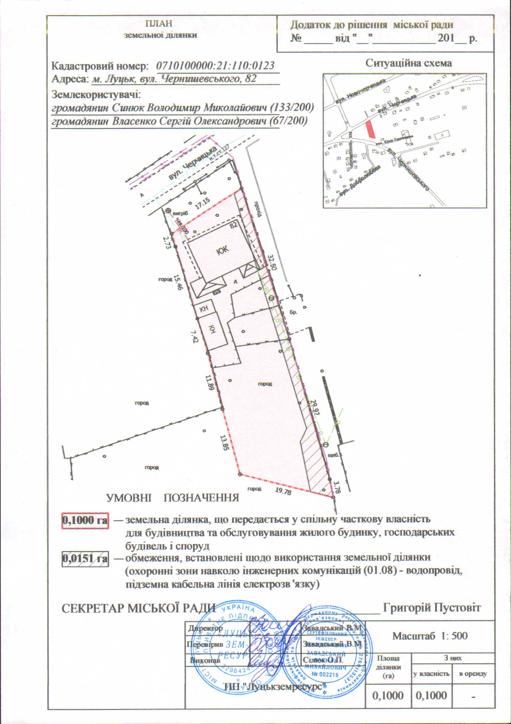 2. Передати громадянам Синюку Володимиру Миколайовичу (частка 133/200), Власенку Сергію Олександровичу (частка 67/200) безоплатно у спільну часткову власність земельну ділянку на вул. Чернишевського, 82 площею 0,1000 га, кадастровим номером 0710100000:21:110:0123 для