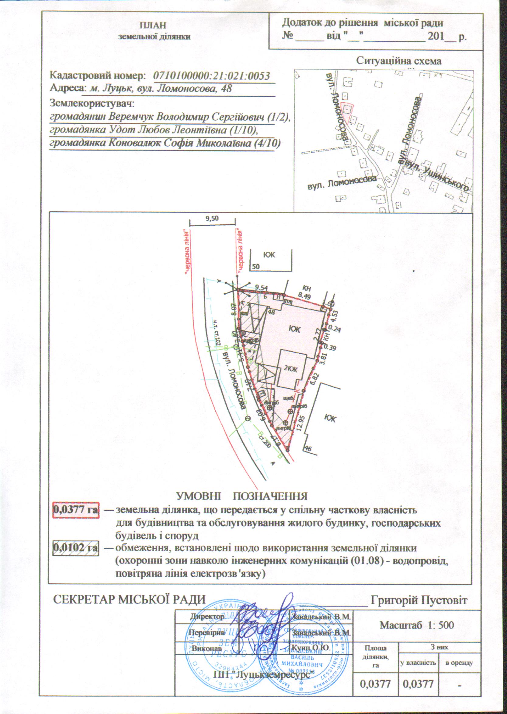 1. Затвердити громадянам Веремчуку Володимиру Сергійовичу (частка 1/2), Удот Любов Леонтіївні (частка 1/10), Коновалюк Софії Миколаївні (частка 4/10) технічну документацію із землеустрою щодо встановлення (відновлення) меж земельної ділянки в натурі (на місцевості) на вул. Ломоносова, 48 площею 0,0377 га, кадастровим номером 0710100000:21:021:0053 для будівництва та обслуговування жилого будинку, господарських будівель і споруд.