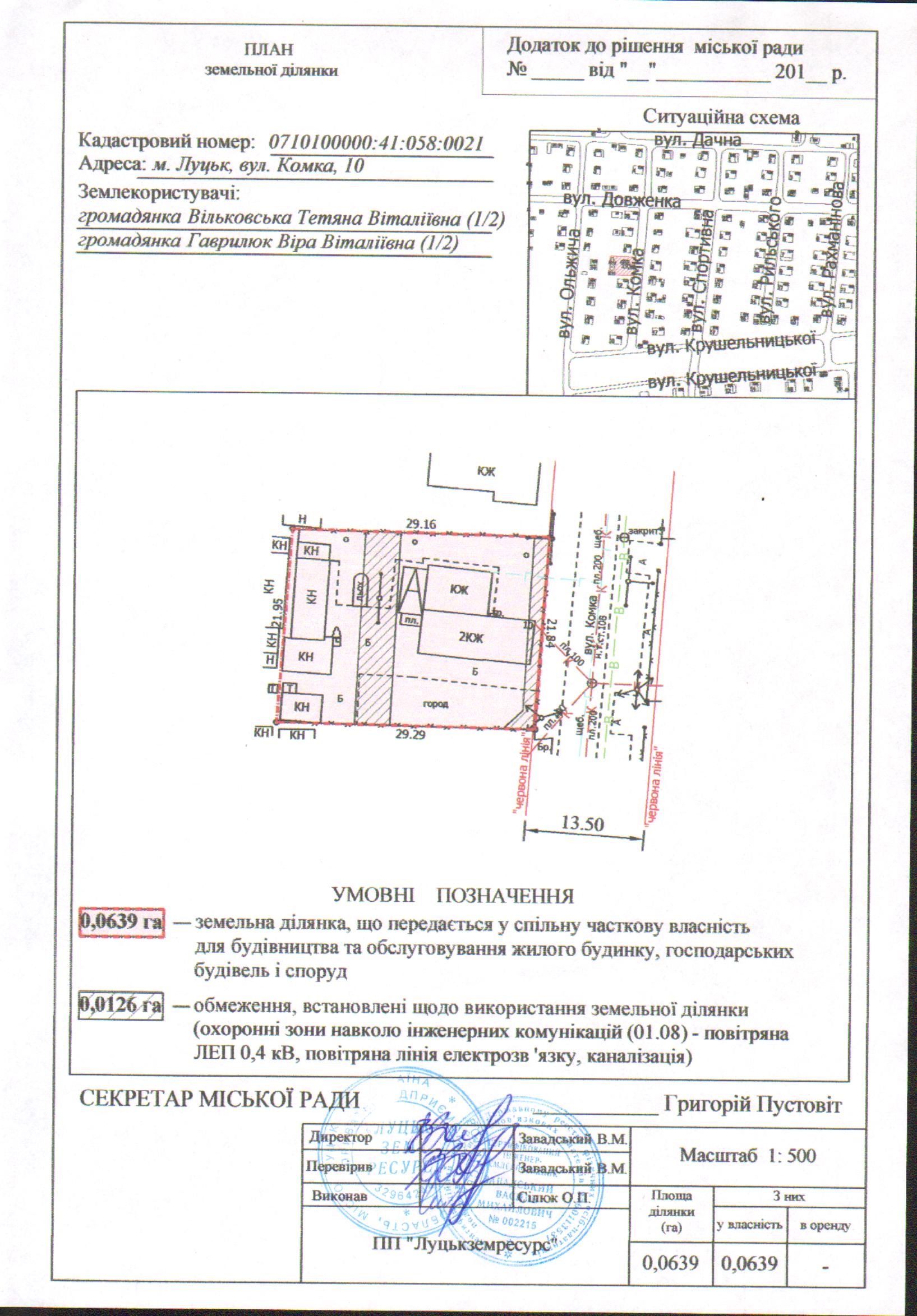 2. Передати громадянам Вільковській Тетяні Віталіївні (частка 1/2), Гаврилюк Вірі Віталіївні (частка 1/2) безоплатно у спільну часткову власність земельну ділянку на вул. Комка, 10 площею 0,0639 га, кадастровим