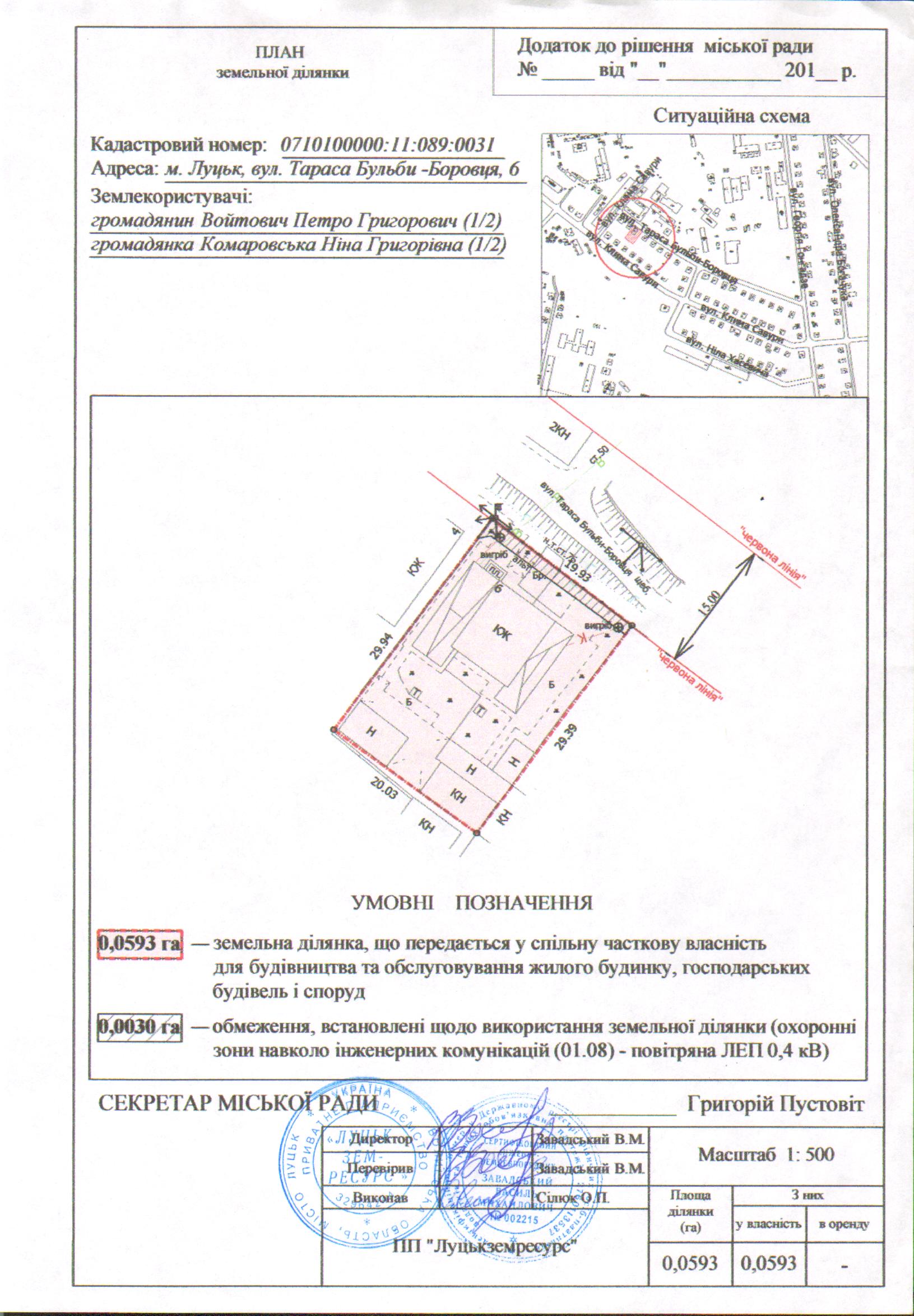 1. Затвердити громадянам Войтовичу Петру Григоровичу (частка 1/2), Комаровській Ніні Григорівні (частка 1/2) технічну документацію із землеустрою щодо встановлення (відновлення) меж земельної ділянки в натурі (на місцевості) на вул. Тараса Бульби-Боровця, 6 площею 0,0593 га, кадастровим номером 0710100000:11:089:0031 для будівництва та обслуговування жилого будинку, господарських будівель і споруд.
