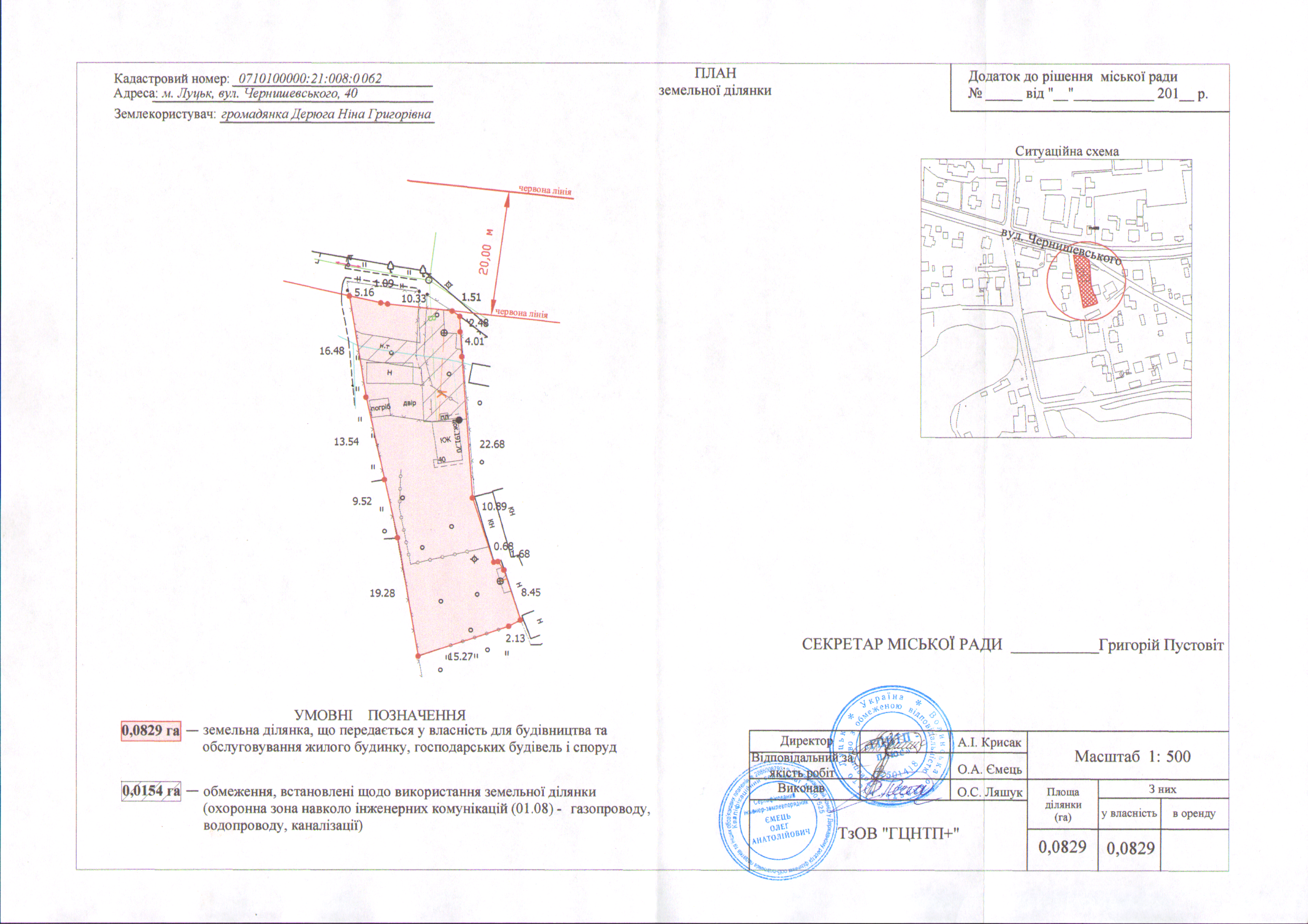 1. Затвердити громадянці Дерюзі Ніні Григорівні технічну документацію із землеустрою щодо встановлення (відновлення) меж земельної ділянки в натурі (на місцевості) на вул. Чернишевського, 40 площею 0,0829 га, кадастровим номером 0710100000:21:008:0062 для будівництва та обслуговування жилого будинку, господарських будівель і споруд.