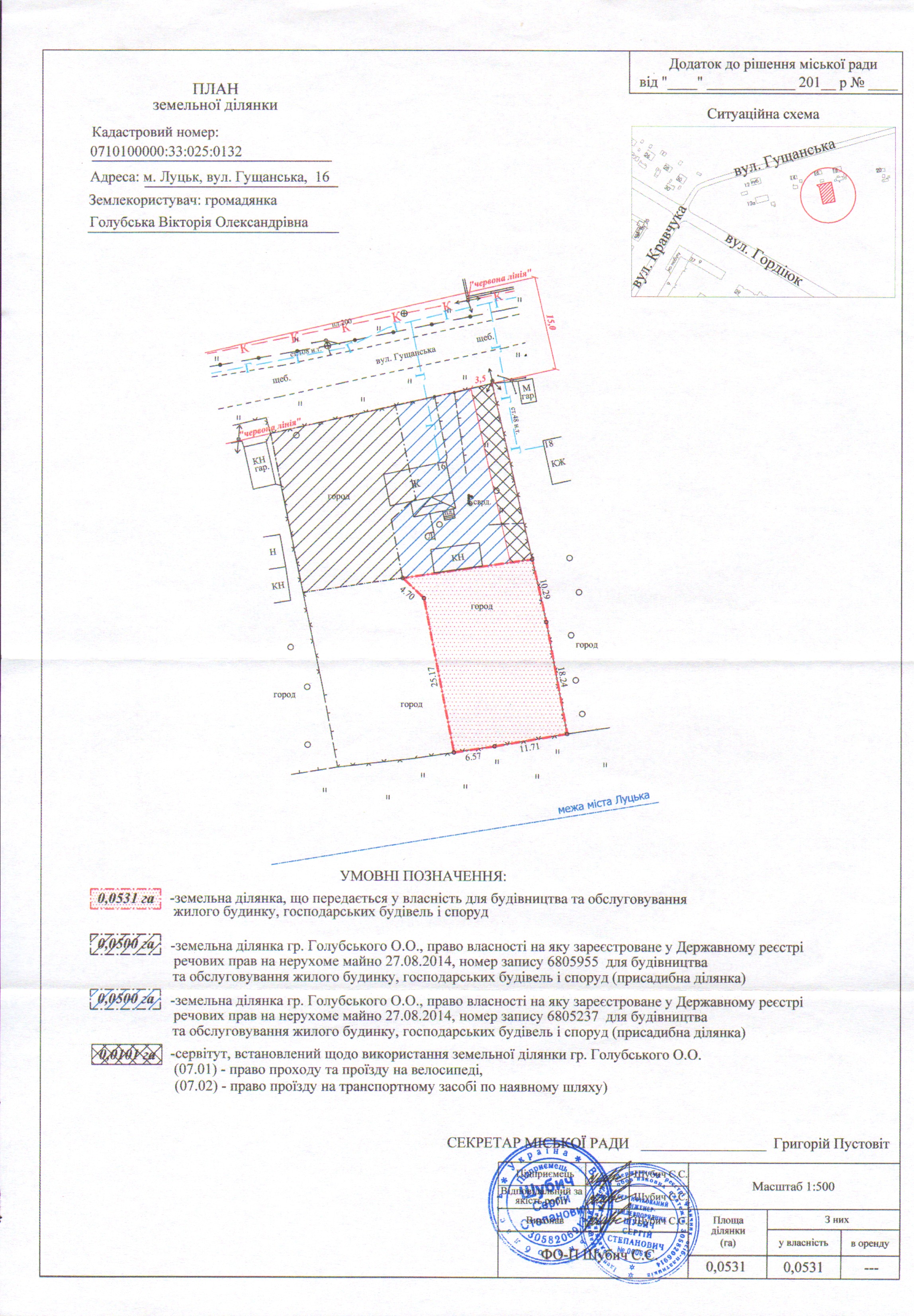 2. Передати громадянці Голубській Вікторії Олександрівні безоплатно у власність земельну ділянку на вул. Гущанській, 16 площею 0,0531 га, кадастровим номером 0710100000:33:025:0132 для будівництва та обслуговування жилого будинку, господарських будівель і споруд, згідно з додатком.