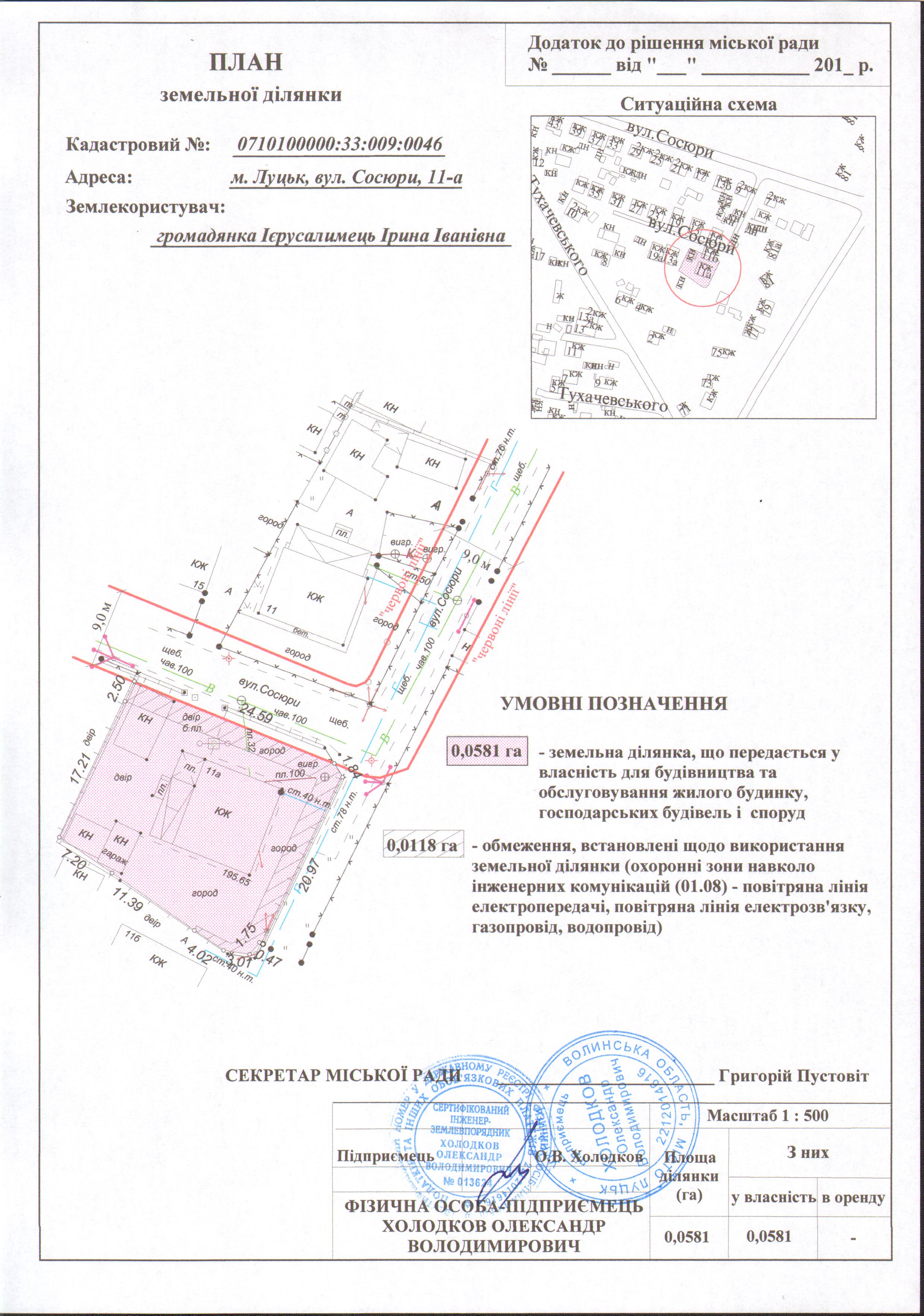2. Передати громадянці Ієрусалимець Ірині Іванівні безоплатно у власність земельну ділянку на вул. Сосюри, 11-а площею 0,0581 га, кадастровим номером 0710100000:33:009:0046 для будівництва та обслуговування жилого будинку, господарських будівель і споруд, згідно з додатком.