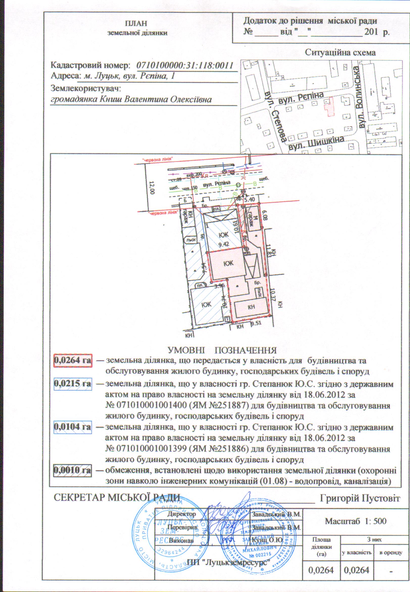 2. Передати громадянці Книш Валентині Олексіївні безоплатно у власність земельну ділянку на вул. Рєпіна, 1 площею 0,0264 га, кадастровим номером 0710100000:31:118:0011 для будівництва та обслуговування жилого будинку, господарських будівель і споруд, згідно з додатком.