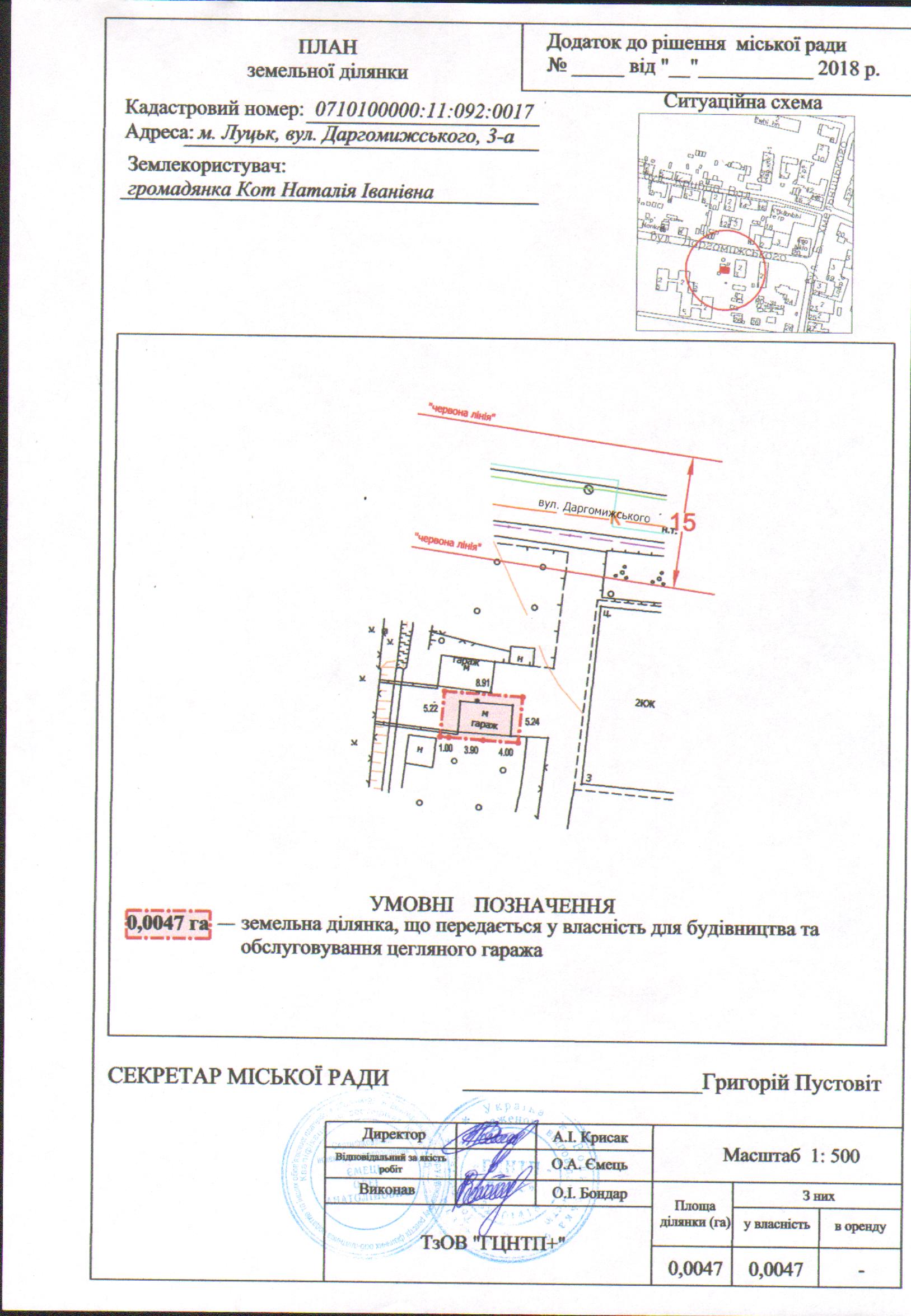 2. Передати громадянці Кот Наталії Іванівні безоплатно у власність земельну ділянку на вул. Даргомижського, 3-а площею 0,0047 га, кадастровим номером 0710100000:11:092:0017 для будівництва та обслуговування цегляного гаража, згідно з додатком.