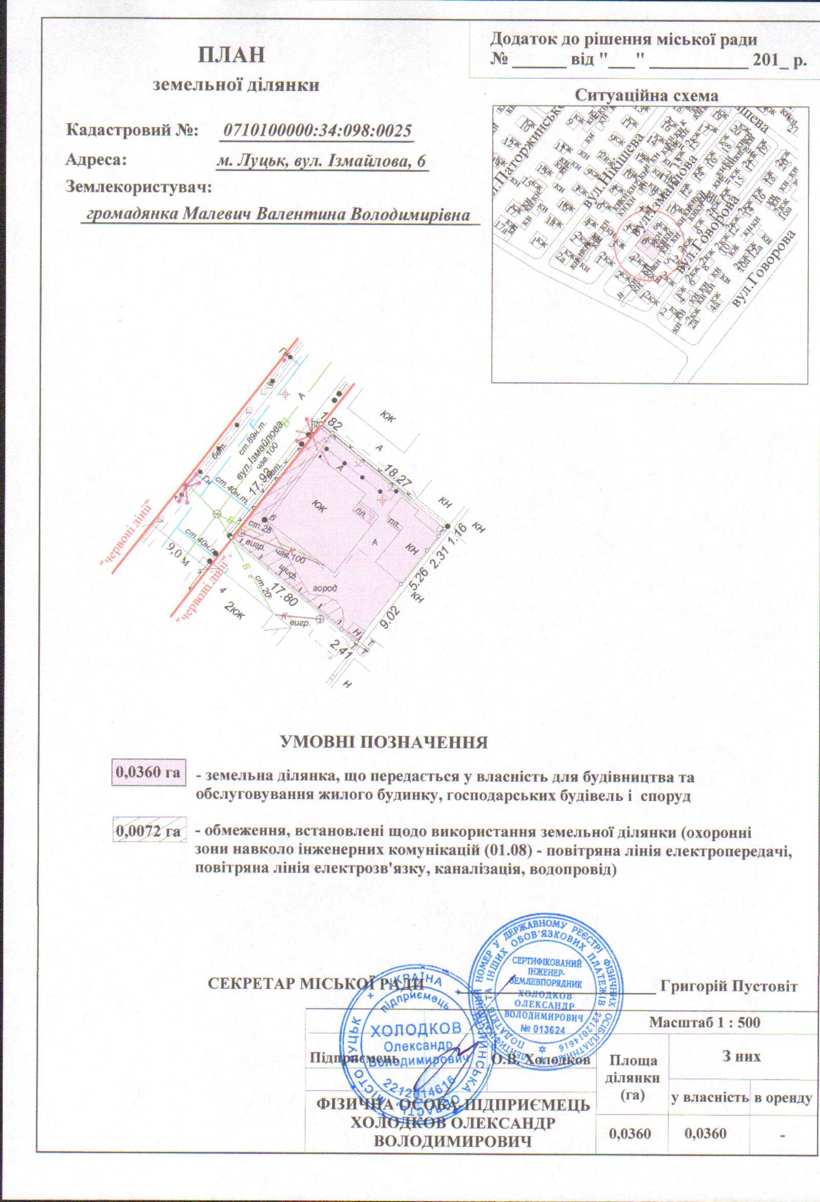 2. Передати громадянці Малевич Валентині Володимирівні безоплатно у власність земельну ділянку на вул. Ізмайлова, 6 площею 0,0360 га, кадастровим номером 0710100000:34:098:0025 для будівництва та обслуговування жилого будинку, господарських будівель і споруд, згідно з додатком.