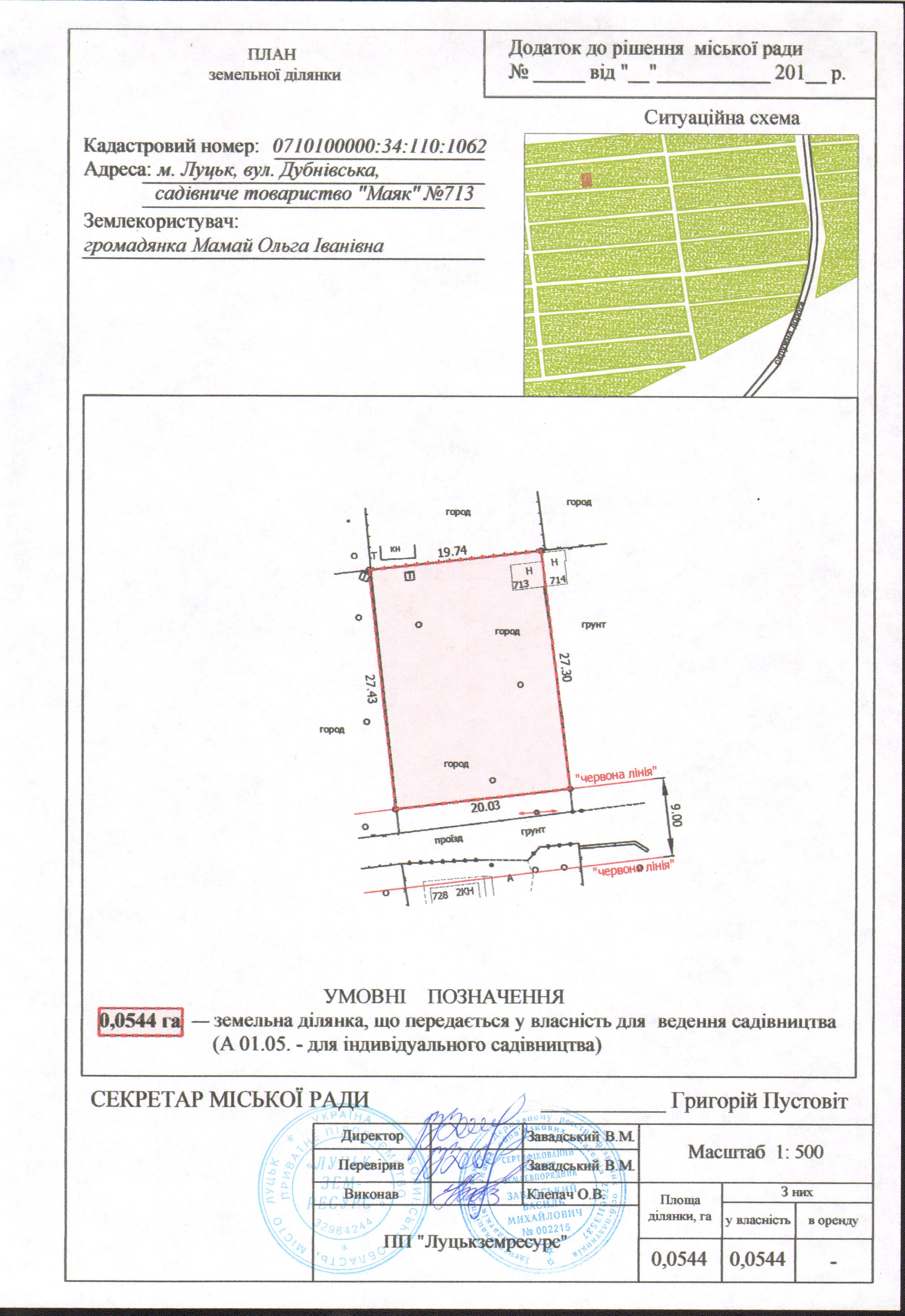 2. Передати громадянці Мамай Ользі Іванівні безоплатно у власність земельну ділянку на вул. Дубнівській в садівничому товаристві «Маяк» №713 площею 0,0544 га, кадастровим номером 0710100000:34:110:1062 для ведення садівництва, згідно з додатком.
