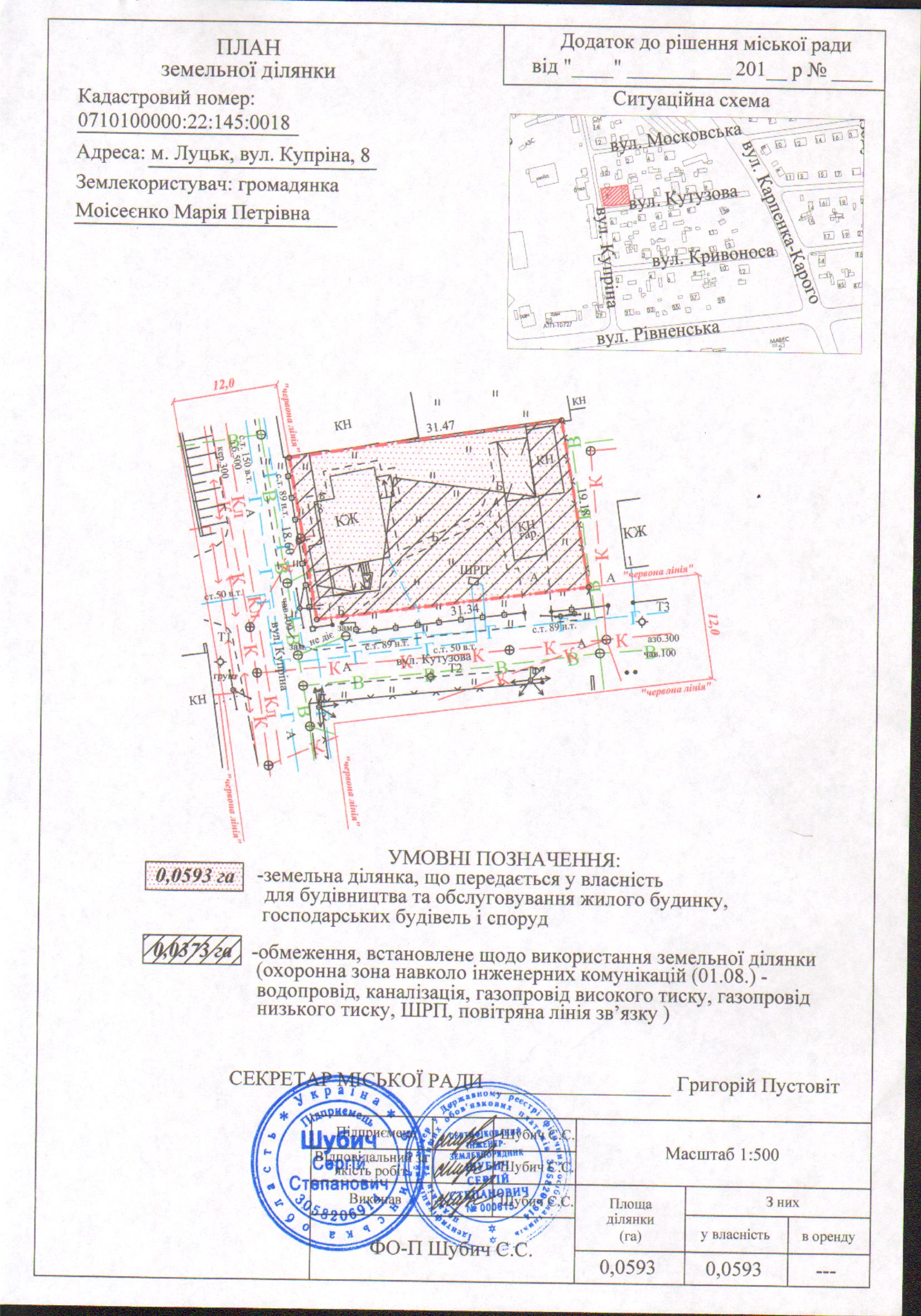 2. Передати громадянці Моісеєнко Марії Петрівні безоплатно у власність земельну ділянку на вул. Купріна, 8 площею 0,0593 га, кадастровим номером 0710100000:22:145:0018 для будівництва та обслуговування жилого будинку, господарських будівель і споруд, згідно з додатком.