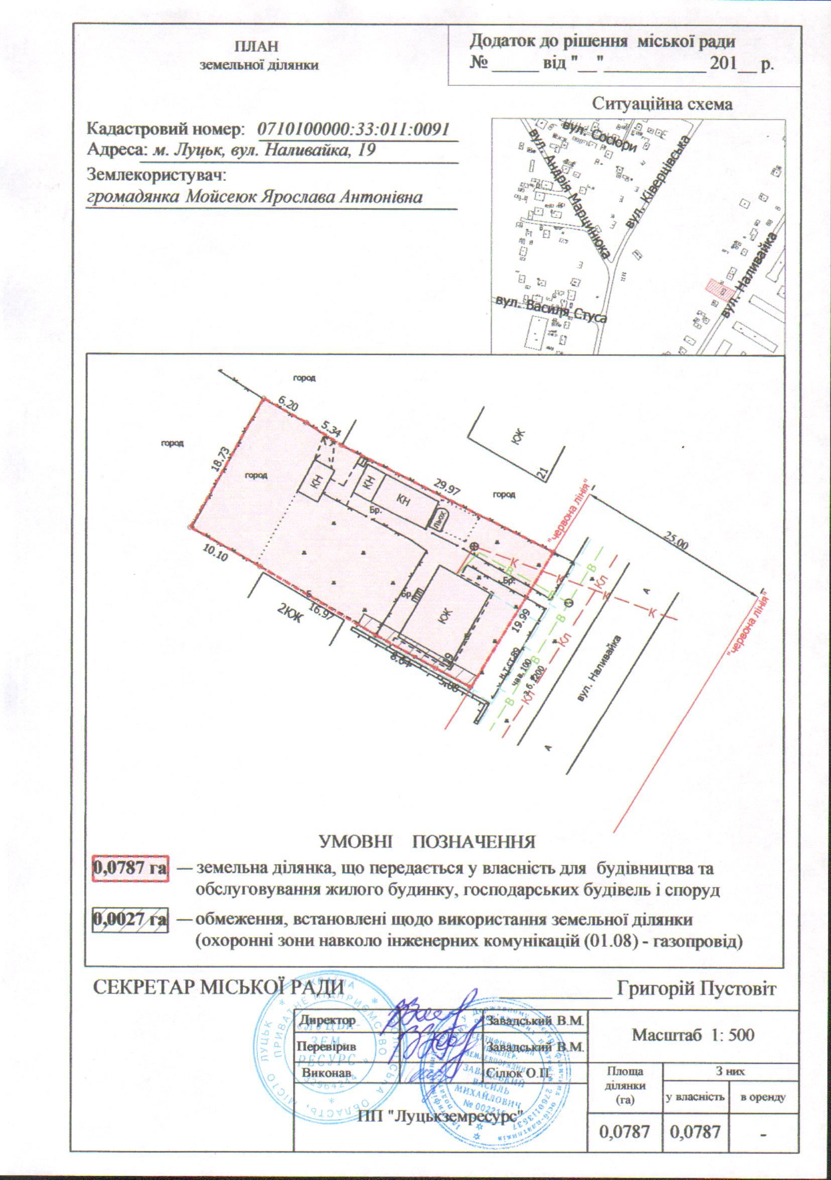 2. Передати громадянці Мойсеюк Ярославі Антонівні безоплатно у власність земельну ділянку на вул. Наливайка, 19 площею 0,0787 га, кадастровим номером 0710100000:33:011:0091 для будівництва та обслуговування жилого будинку, господарських будівель і споруд, згідно з додатком.