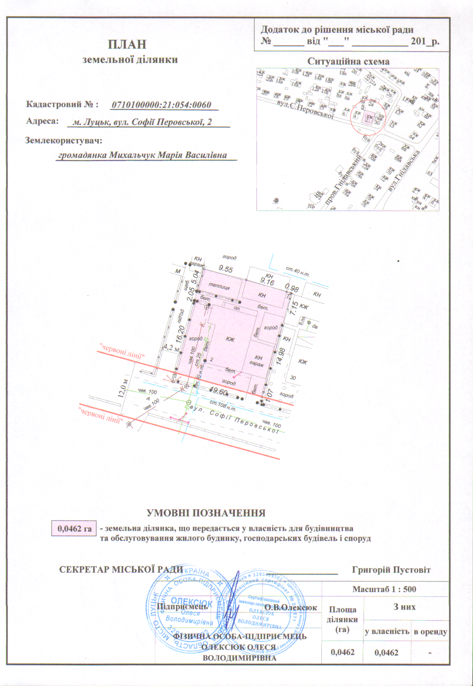 2. Передати громадянці Михальчук Марії Василівні безоплатно у власність земельну ділянку на вул. Софії Перовської, 2 площею 0,0462 га, кадастровим номером 0710100000:21:054:0060 для будівництва та обслуговування жилого будинку, господарських будівель і споруд, згідно з додатком.