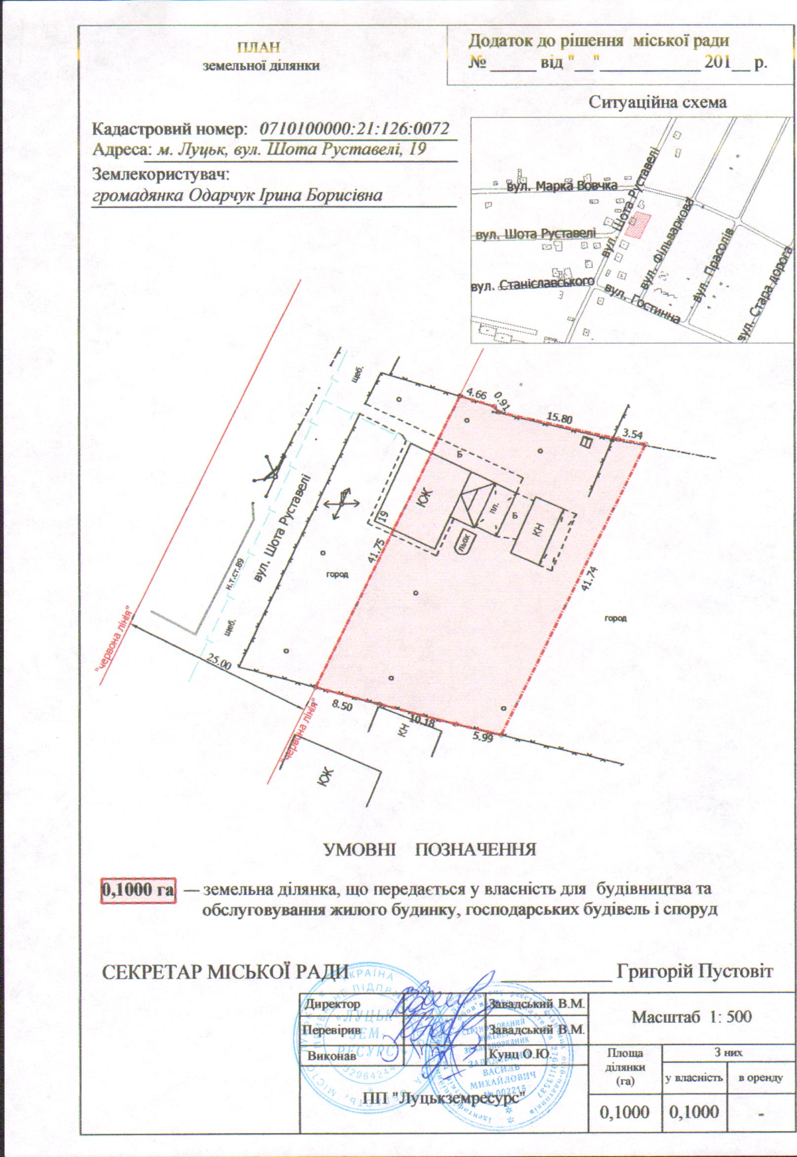 2. Передати громадянці Одарчук Ірині Борисівні безоплатно у власність земельну ділянку на вул. Шота Руставелі, 19 площею 0,1000 га, кадастровим номером 0710100000:21:126:0072 для будівництва та обслуговування жилого будинку, господарських будівель і споруд, згідно з додатком.