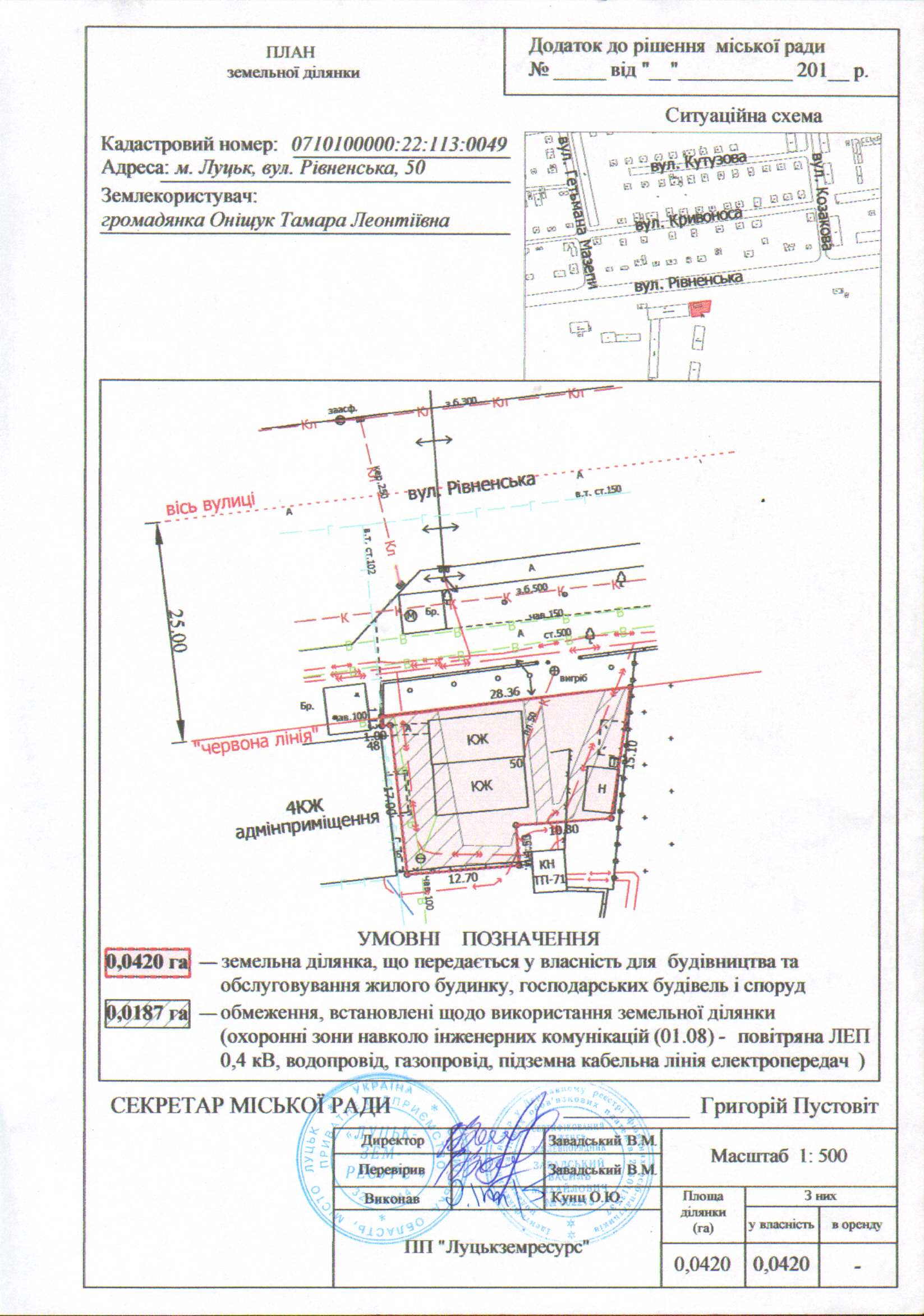 2. Передати громадянці Оніщук Тамарі Леонтіївні безоплатно у власність земельну ділянку на вул. Рівненській, 50 площею 0,0420 га, кадастровим номером 0710100000:22:113:0049 для будівництва та обслуговування жилого будинку, господарських будівель і споруд, згідно з додатком.