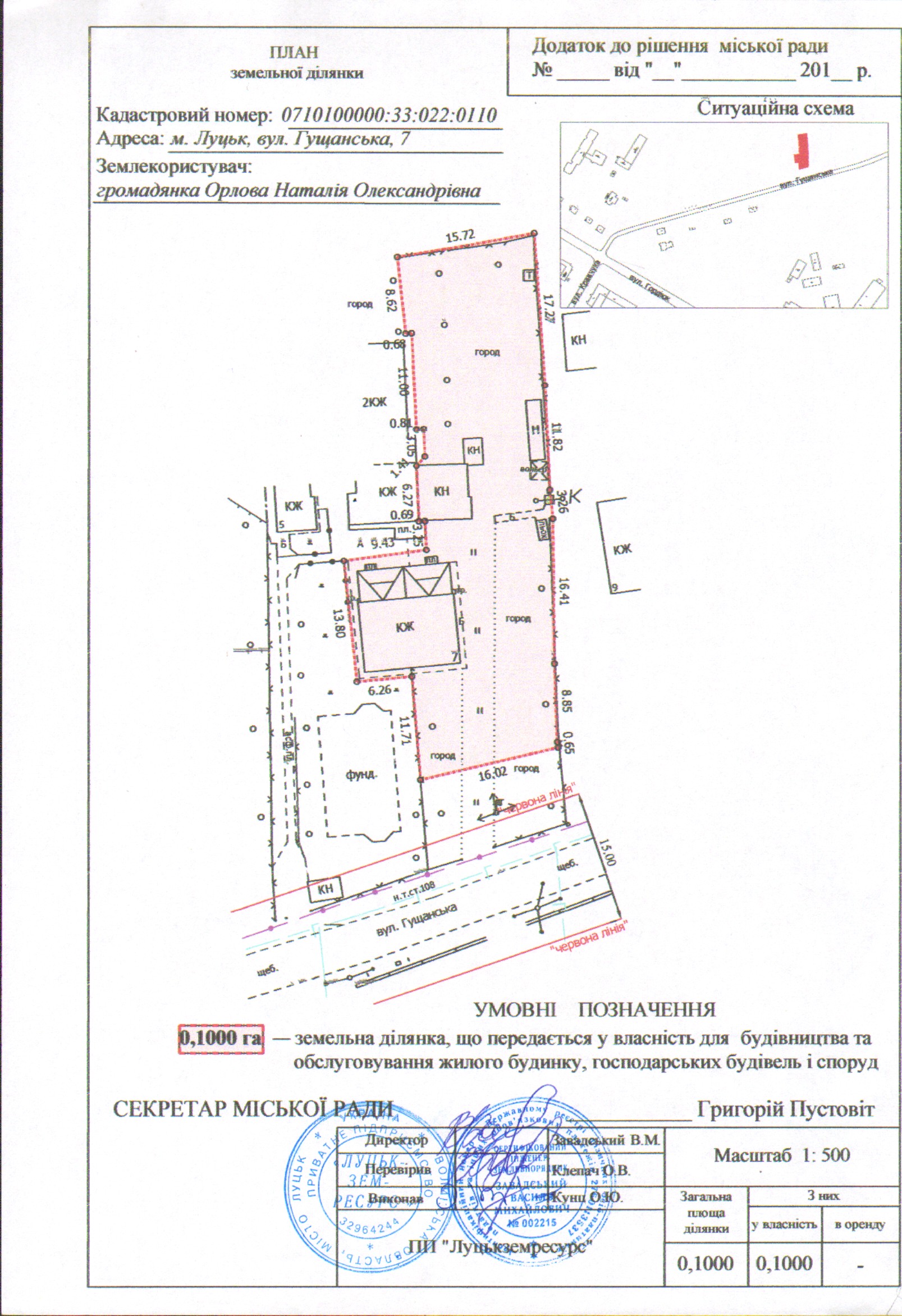 2. Передати громадянці Орловій Наталії Олександрівні безоплатно у власність земельну ділянку на вул. Гущанській, 7 площею 0,1000 га, кадастровим номером 0710100000:33:022:0110 для будівництва та обслуговування жилого будинку, господарських будівель і споруд, згідно з додатком.