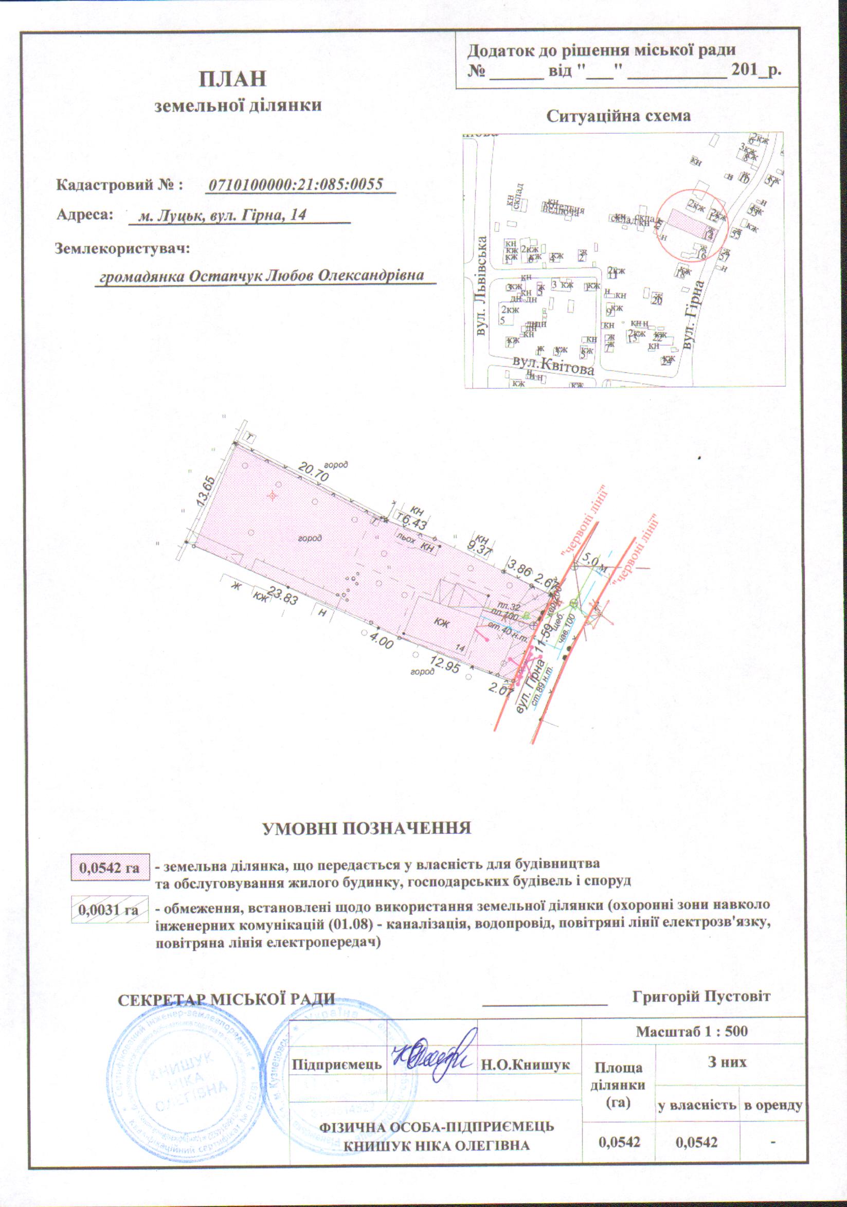 2. Передати громадянці Остапчук Любові Олександрівні безоплатно у власність земельну ділянку на вул. Гірній, 14 площею 0,0542 га, кадастровим номером 0710100000:21:085:0055 для будівництва та обслуговування жилого будинку, господарських будівель і споруд, згідно з додатком.