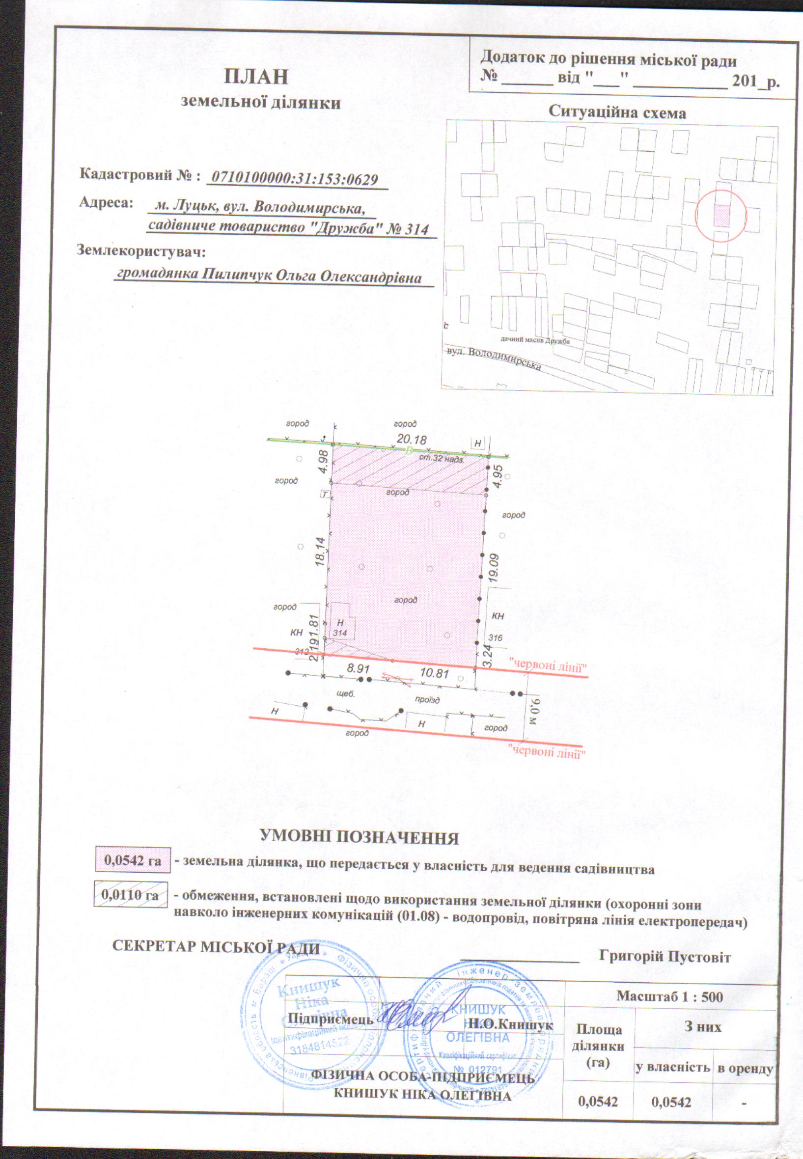 2. Передати громадянці Пилипчук Ользі Олександрівни безоплатно у власність земельну ділянку на вул. Володимирській в садівничому товаристві «Дружба» №314 площею 0,0542 га, кадастровим номером 0710100000:31:153:0629 для ведення садівництва, згідно з додатком.