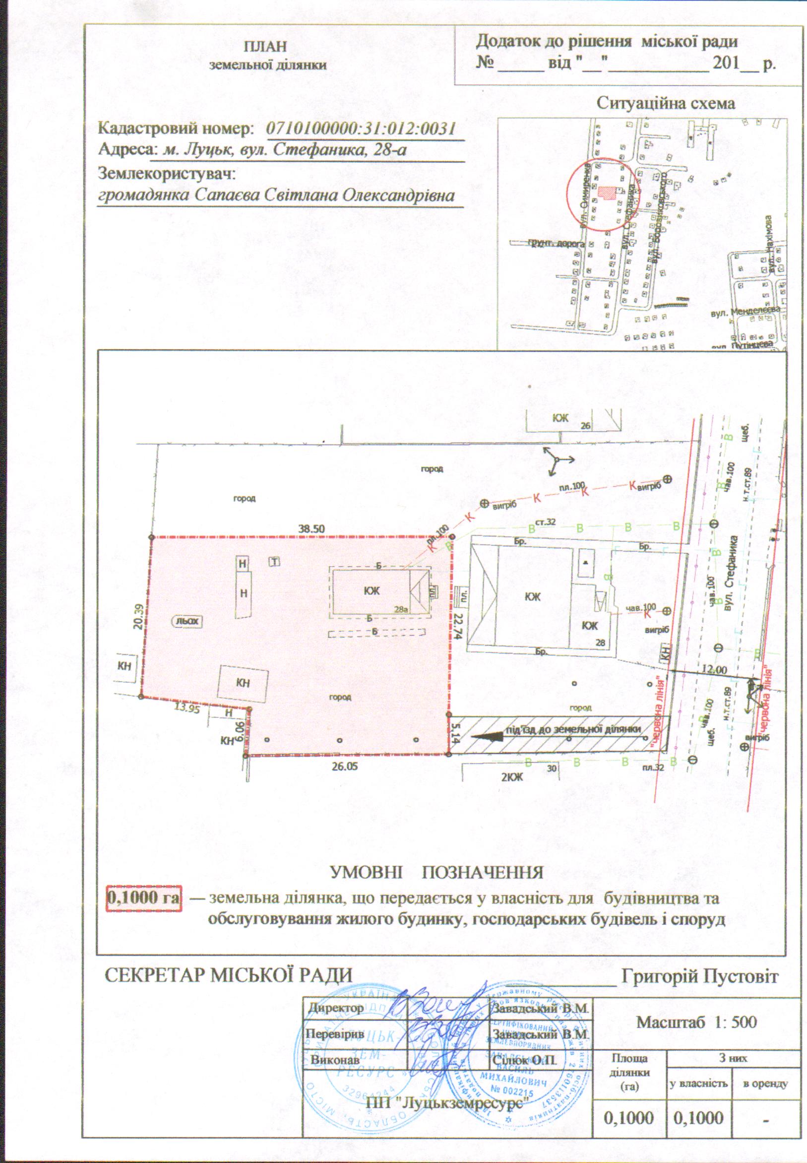 2. Передати громадянці Сапаєвій Світлані Олександрівні безоплатно у власність земельну ділянку на вул. Стефаника, 28-а площею 0,1000 га, кадастровим номером 0710100000:31:012:0031 для будівництва та обслуговування жилого будинку, господарських будівель і споруд, згідно з додатком.