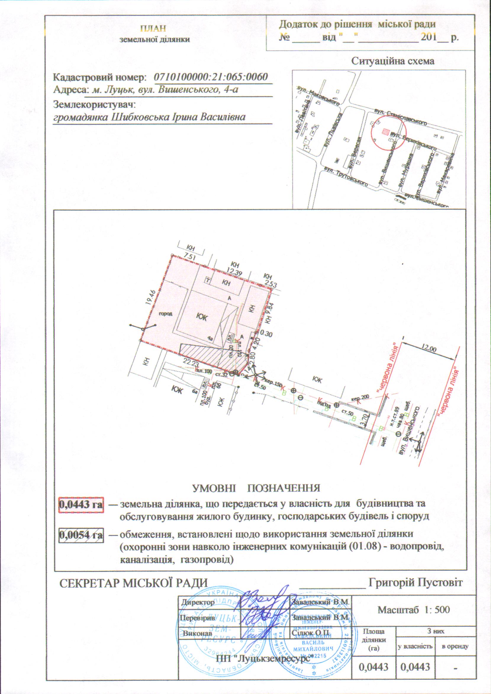 1. Затвердити громадянці Шибковській Ірині Василівні технічну документацію із землеустрою щодо встановлення (відновлення) меж земельної ділянки в натурі (на місцевості) на вул. Вишенського, 4-а площею 0,0443 га, кадастровим номером 0710100000:21:065:0060 для будівництва та обслуговування жилого будинку, господарських будівель і споруд.