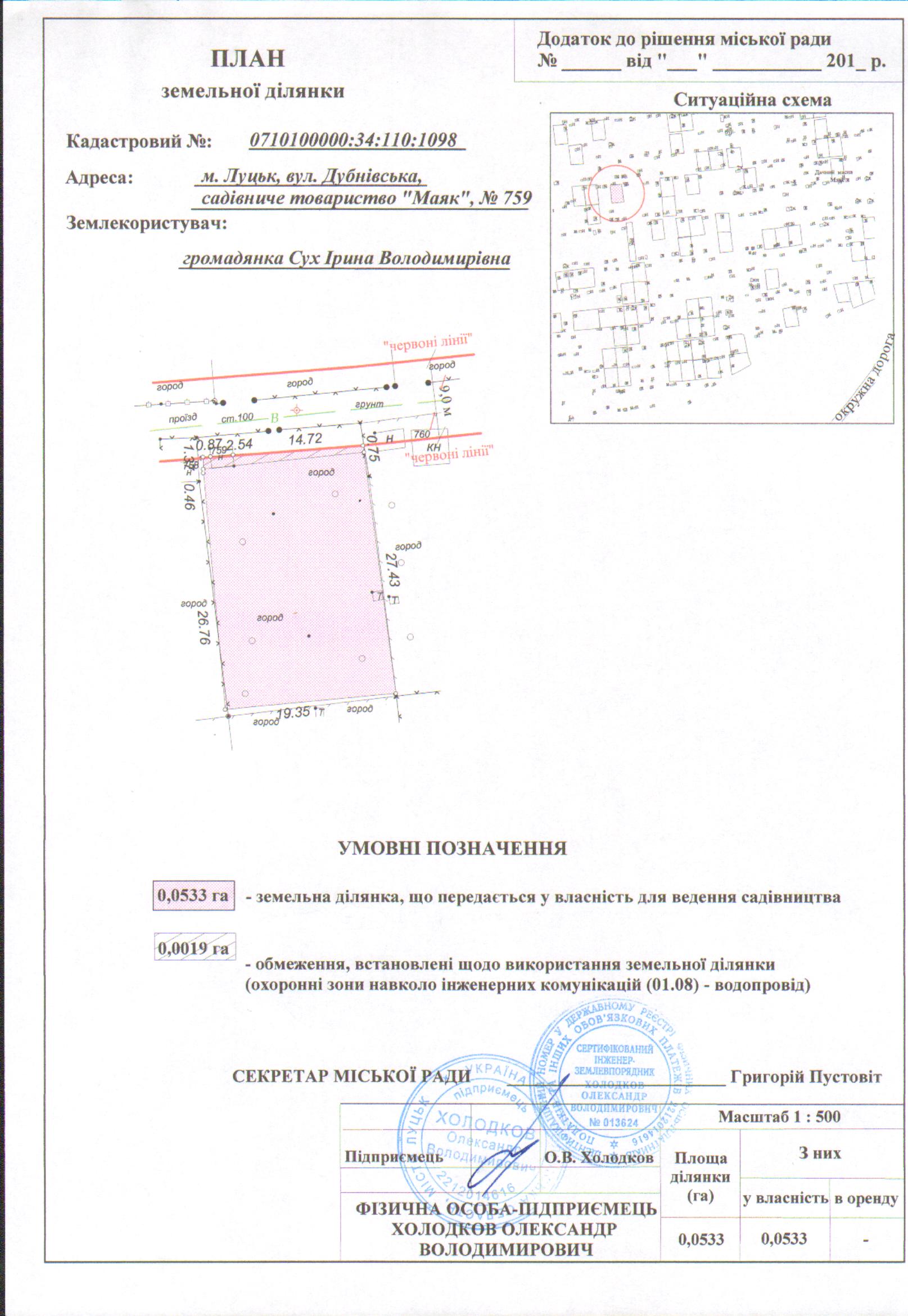 2. Передати громадянці Сух Ірині Володимирівні безоплатно у власність земельну ділянку на вул. Дубнівській в садівничому товаристві «Маяк» №759 площею 0,0533 га, кадастровим номером 0710100000:34:110:1098 для ведення садівництва, згідно з додатком.