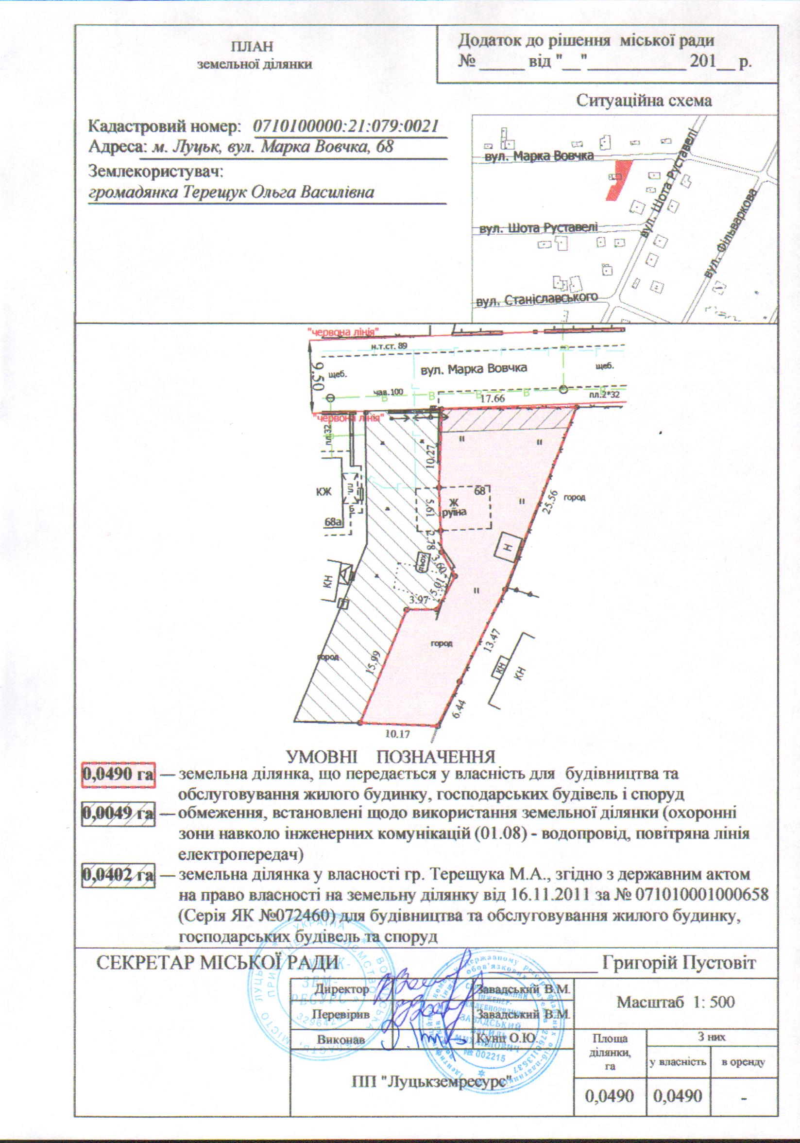 2. Передати громадянці Терещук Ользі Василівні безоплатно у власність земельну ділянку на вул. Марка Вовчка, 68 площею 0,0490 га, кадастровим номером 0710100000:21:079:0021 для будівництва та обслуговування жилого будинку, господарських будівель і споруд, згідно з додатком.