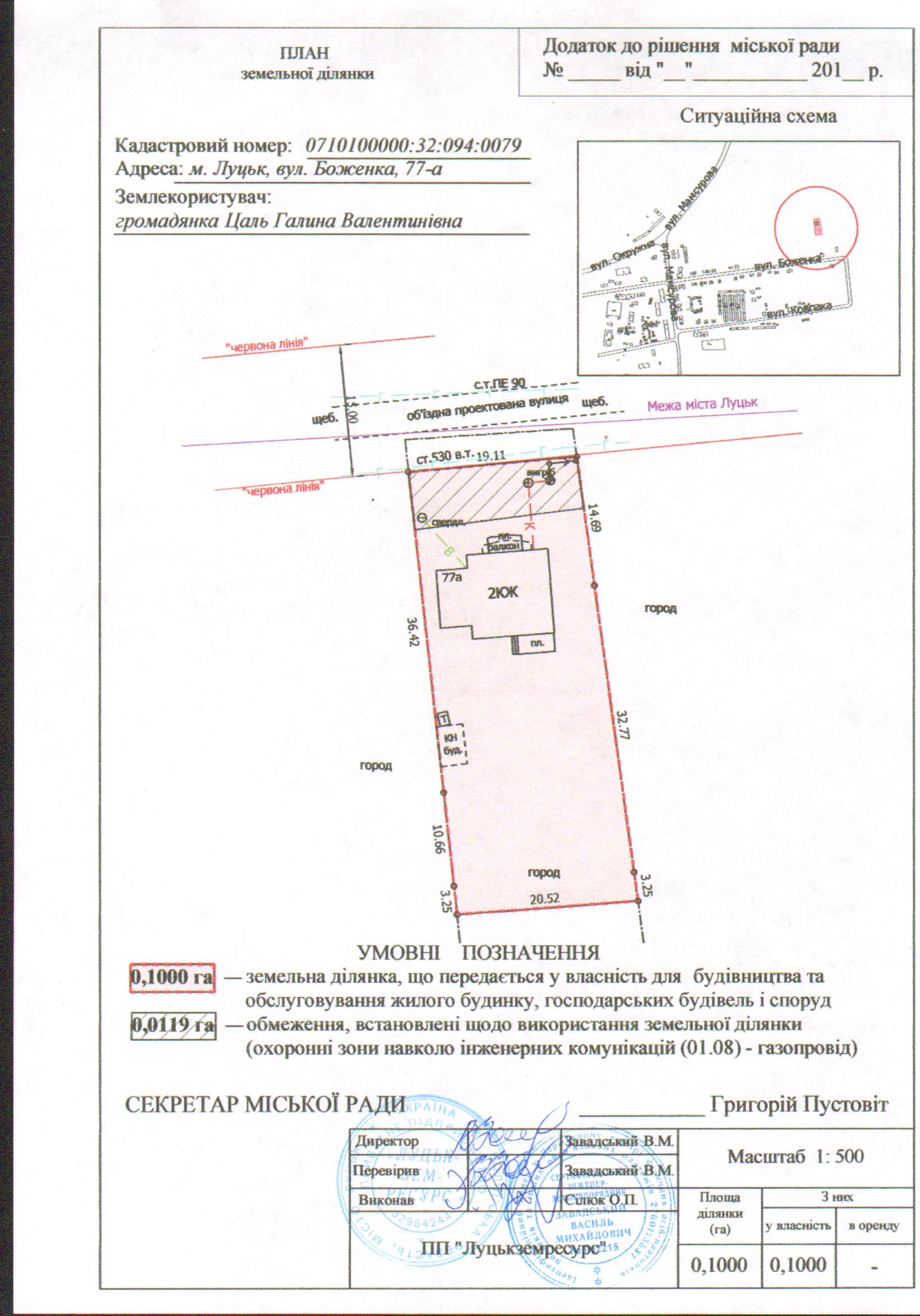 2. Передати громадянці Цаль Галині Валентинівні безоплатно у власність земельну ділянку на вул. Боженка, 77-а площею 0,1000 га, кадастровим номером 0710100000:32:094:0079 для будівництва та обслуговування жилого будинку, господарських будівель і споруд, згідно з додатком.
