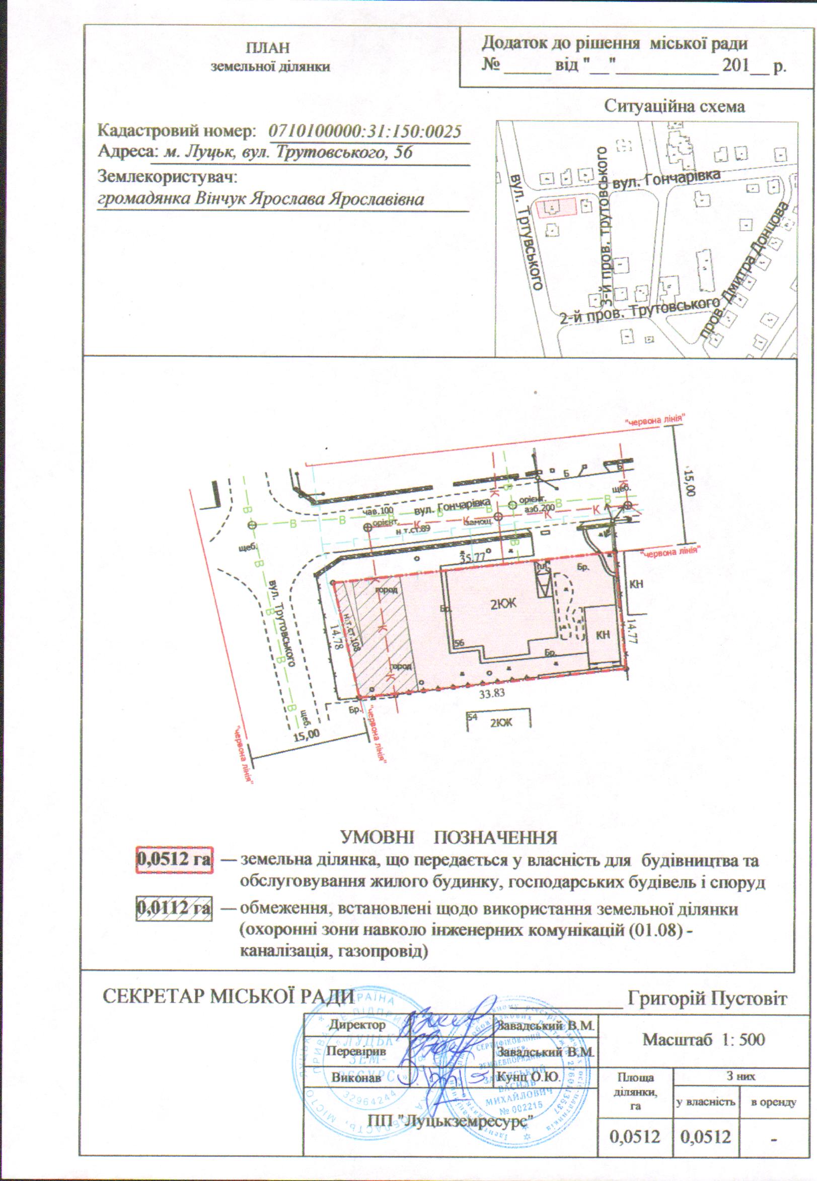 2. Передати громадянці Вінчук Ярославі Ярославівні безоплатно у власність земельну ділянку на вул. Трутовського, 56 площею 0,0512 га, кадастровим номером 0710100000:31:150:0025 для будівництва та обслуговування жилого будинку, господарських будівель і споруд, згідно з додатком.