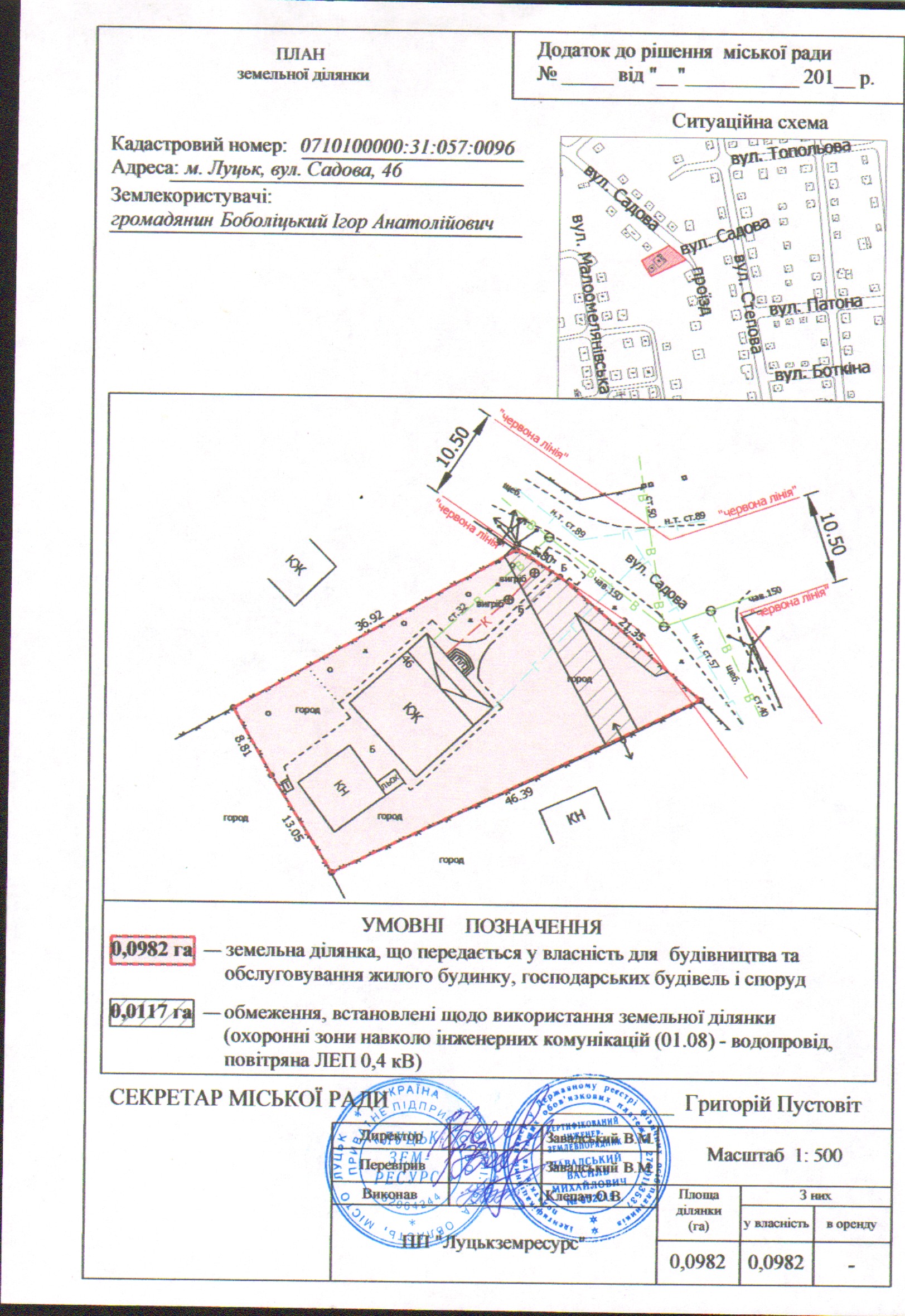 2. Передати громадянину Боболіцькому Ігорю Анатолійовичу безоплатно у власність земельну ділянку на вул. Садовій, 46 площею 0,0982 га, кадастровим номером 0710100000:31:057:0096 для будівництва та обслуговування жилого будинку, господарських будівель і споруд, згідно з додатком.