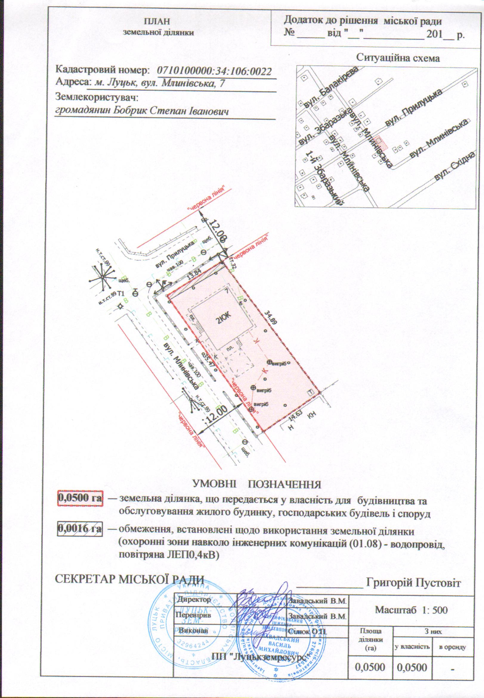 2. Передати громадянину Бобрику Степану Івановичу безоплатно у власність земельну ділянку на вул. Млинівській, 7 площею 0,0500 га, кадастровим номером 0710100000:34:106:0022 для будівництва та обслуговування жилого будинку, господарських будівель і споруд, згідно з додатком.