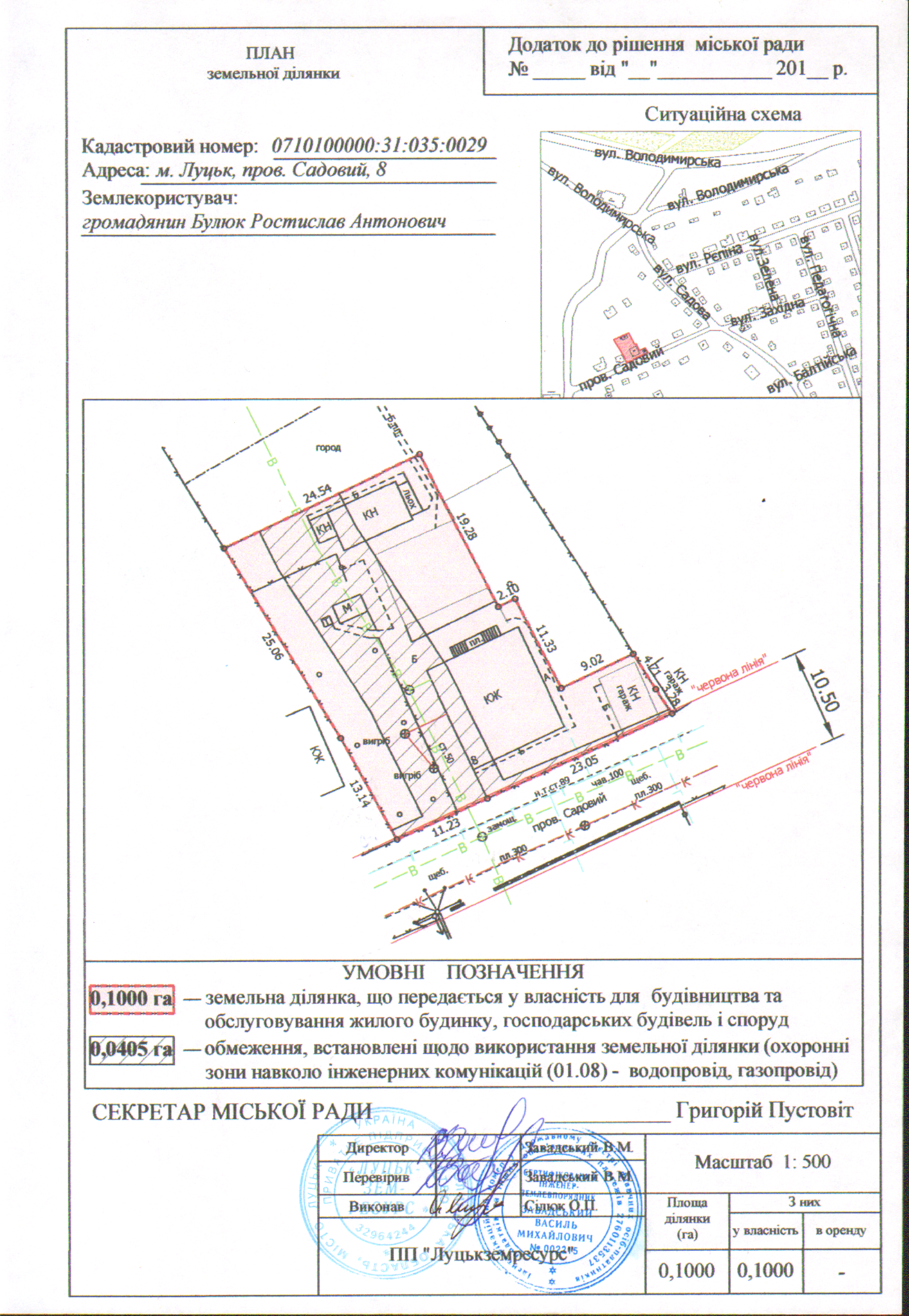 2. Передати громадянину Булюку Ростиславу Антоновичу безоплатно у власність земельну ділянку на пров. Садовому, 8 площею 0,1000 га, кадастровим номером 0710100000:31:035:0029 для будівництва та обслуговування жилого будинку, господарських будівель і споруд, згідно з додатком.