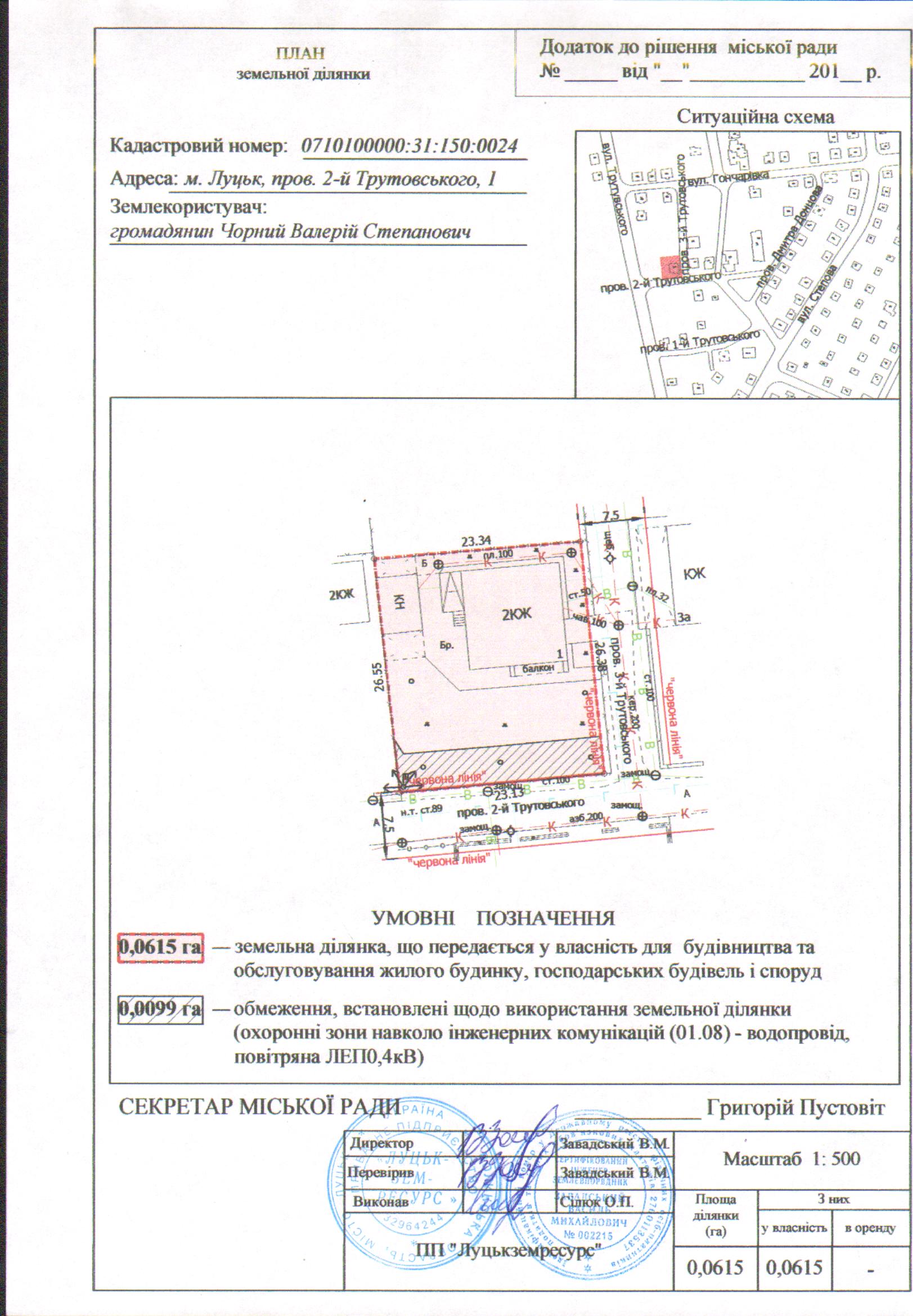 2. Передати громадянину Чорному Валерію Степановичу безоплатно у власність земельну ділянку на пров. 2-ому Трутовського, 1 площею 0,0615 га, кадастровим номером 0710100000:31:150:0024 для будівництва та обслуговування жилого будинку, господарських будівель і споруд, згідно з додатком.