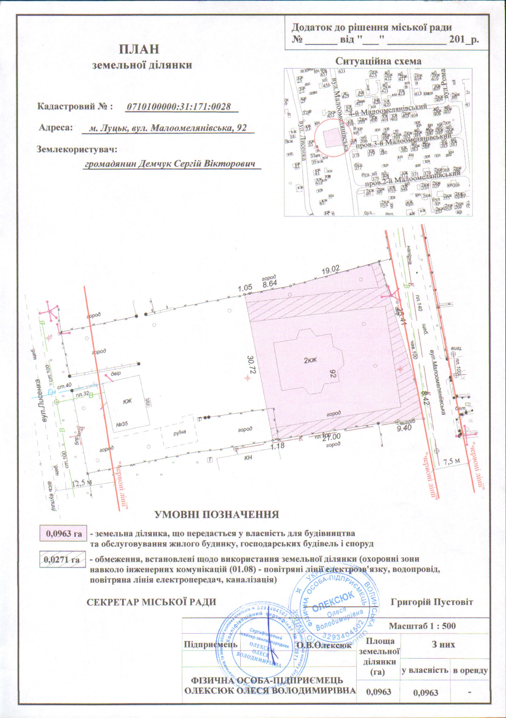 2. Передати громадянину Демчуку Сергію Вікторовичу безоплатно у власність земельну ділянку на вул. Малоомелянівській, 92 площею 0,0963 га, кадастровим номером 0710100000:31:171:0028 для будівництва та обслуговування жилого будинку, господарських будівель і споруд, згідно з додатком.