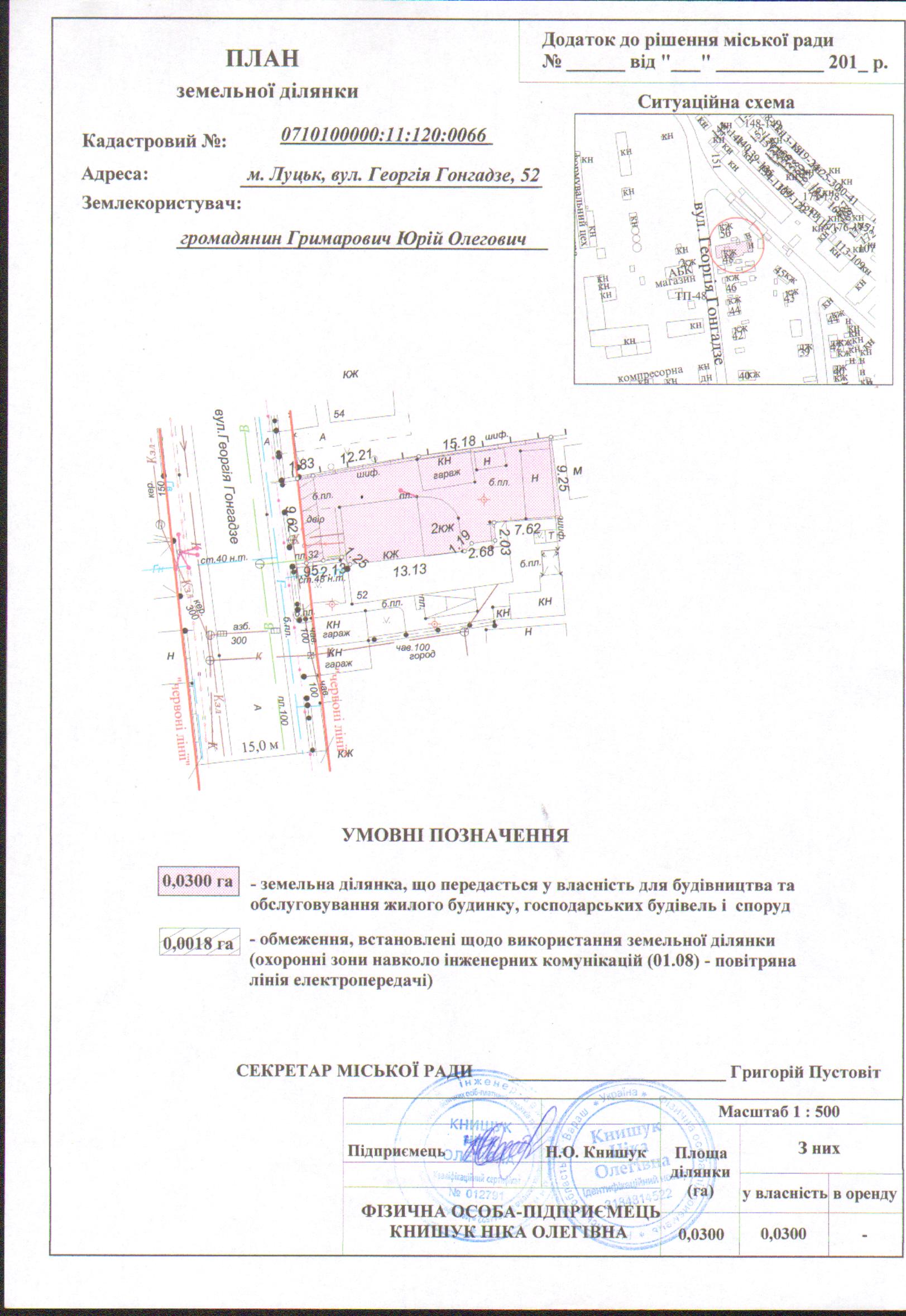2. Передати громадянину Гримаровичу Юрію Олеговичу безоплатно у власність земельну ділянку на вул. Георгія Гонгадзе, 52 площею 0,0300 га, кадастровим номером 0710100000:11:120:0066 для будівництва та обслуговування жилого будинку, господарських будівель і споруд, згідно з додатком.