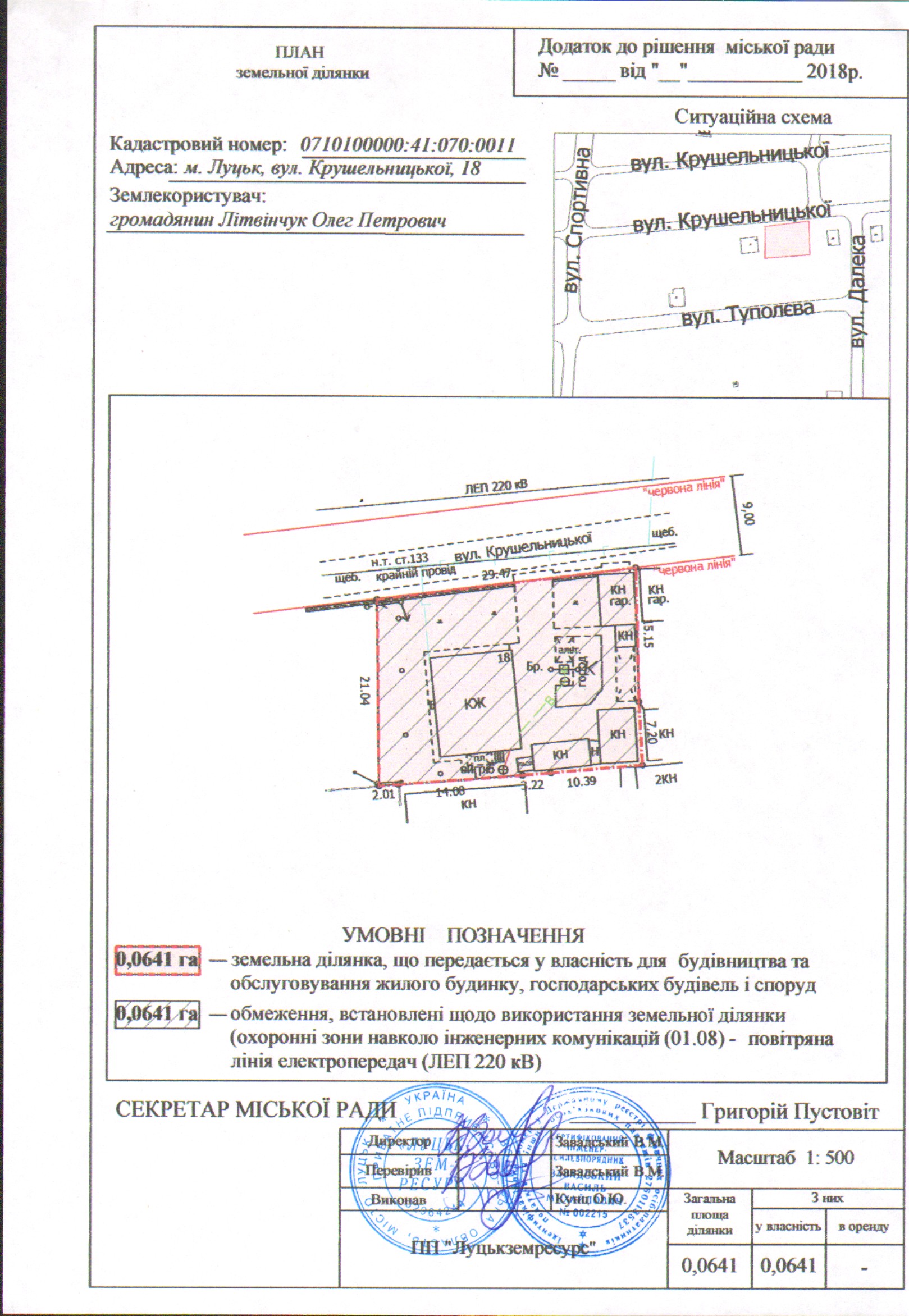 2. Передати громадянину Літвінчуку Олегу Петровичу безоплатно у власність земельну ділянку на вул. Крушельницької, 18 площею 0,0641 га, кадастровим номером 0710100000:41:070:0011 для будівництва та обслуговування жилого будинку, господарських будівель і споруд, згідно з додатком.
