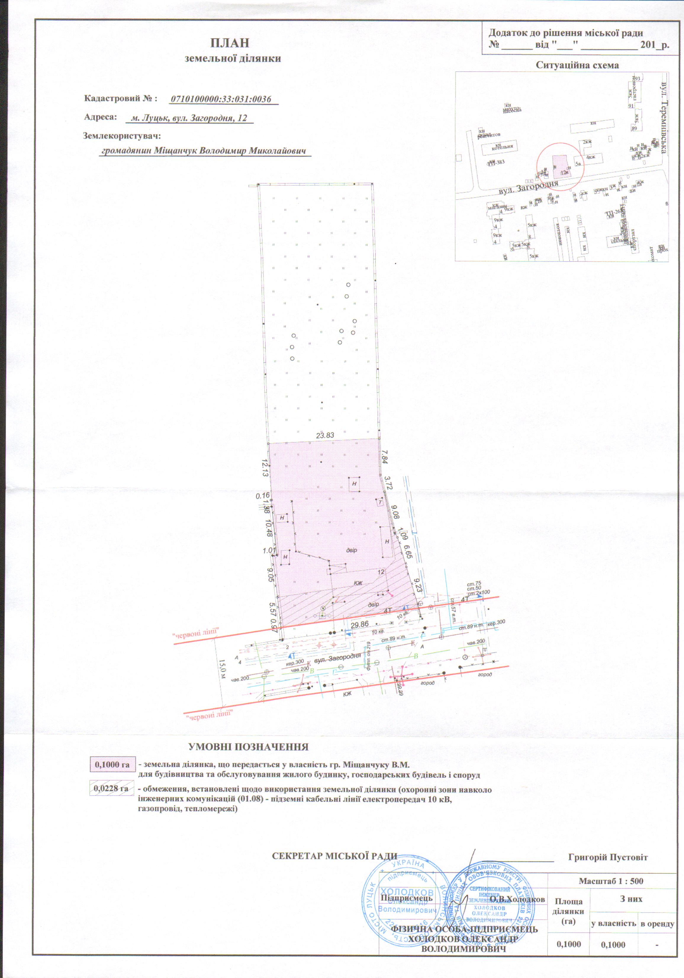 2. Передати громадянину Міщанчуку Володимиру Миколайовичу безоплатно у власність земельну ділянку на вул. Загородній, 12 площею 0,1000 га, кадастровим номером 0710100000:33:031:0036 для будівництва та обслуговування жилого будинку, господарських будівель і споруд, згідно з додатком.
