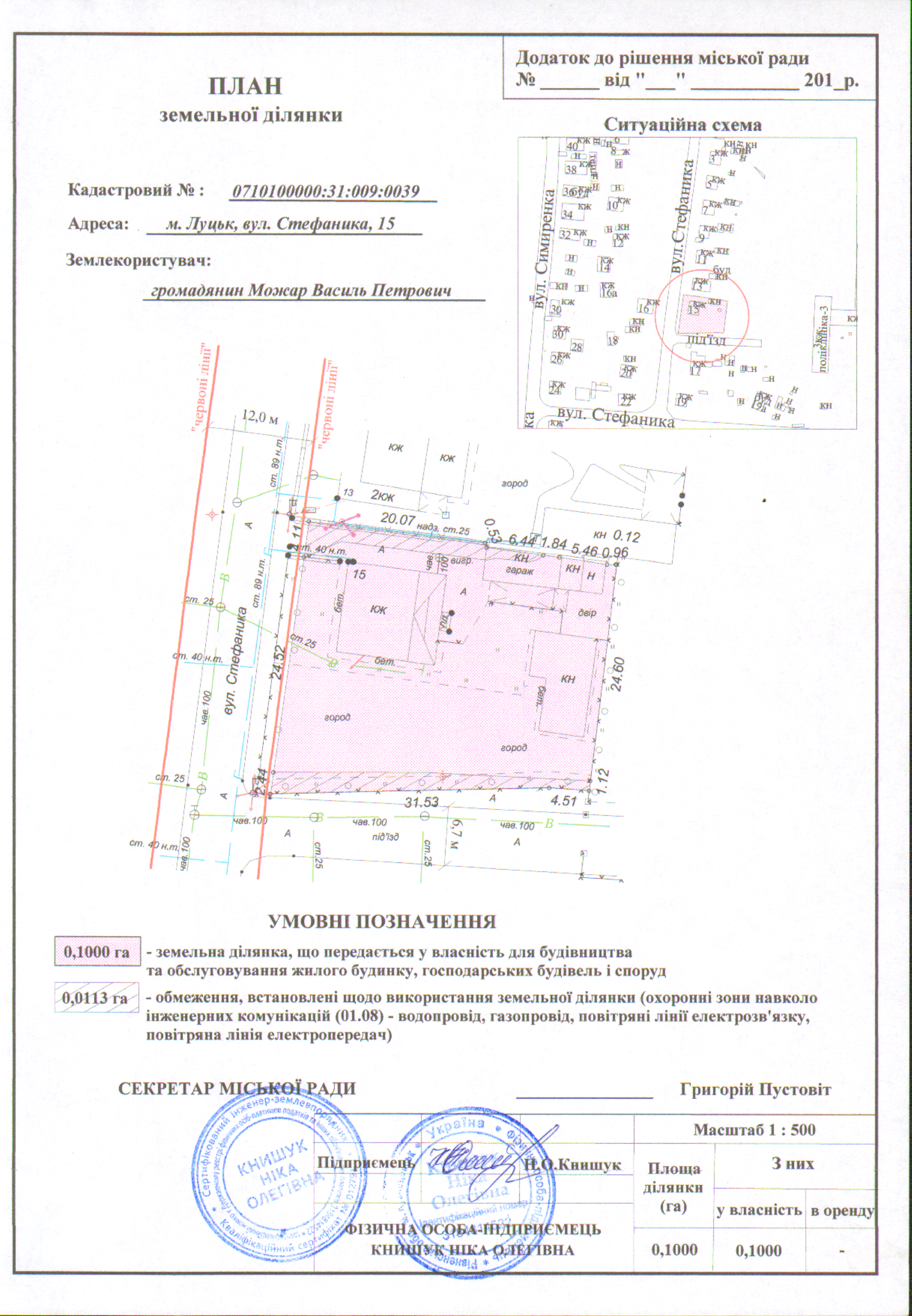 2. Передати громадянину Можару Василю Петровичу безоплатно у власність земельну ділянку на вул. Стефаника, 15 площею 0,1000 га, кадастровим номером 0710100000:31:009:0039 для будівництва та обслуговування жилого будинку, господарських будівель і споруд, згідно з додатком.