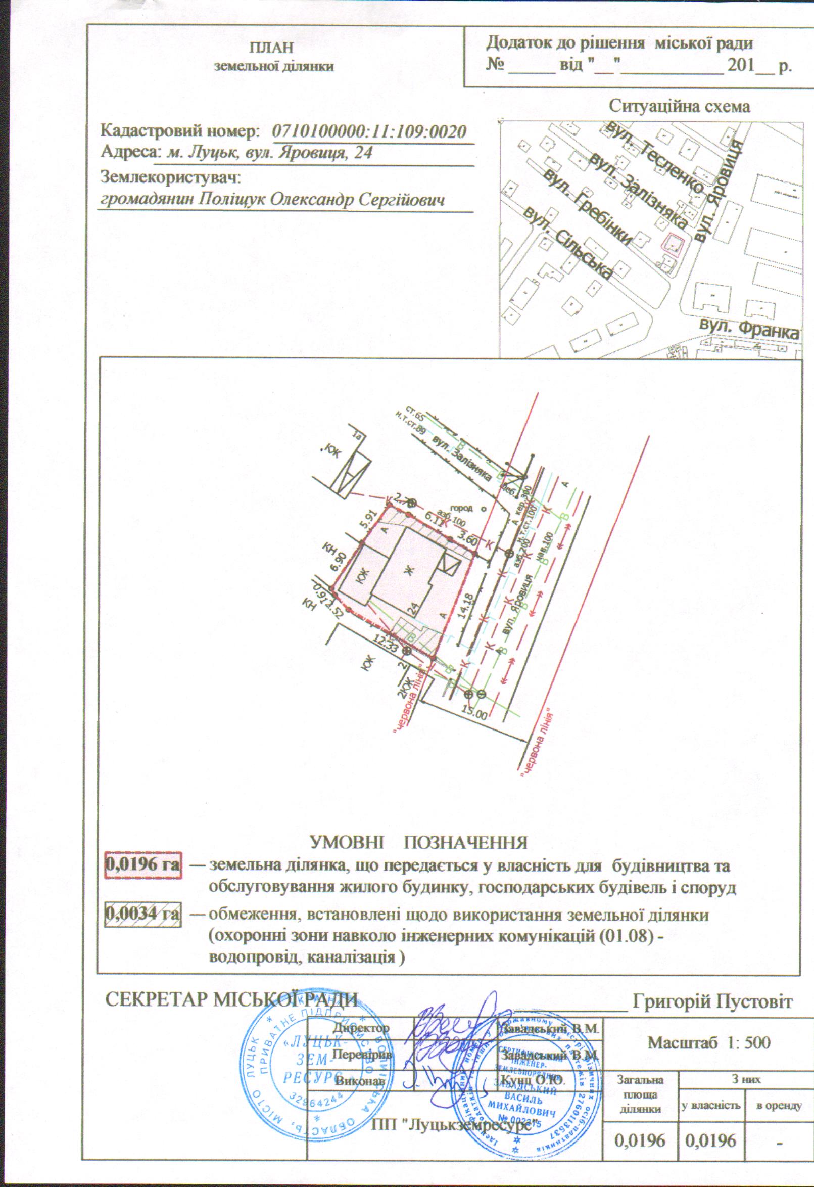2. Передати громадянину Поліщуку Олександру Сергійовичу безоплатно у власність земельну ділянку на вул. Яровиці, 24 площею 0,0196 га, кадастровим номером 0710100000:11:109:0020 для будівництва та обслуговування жилого будинку, господарських будівель і споруд, згідно з додатком.