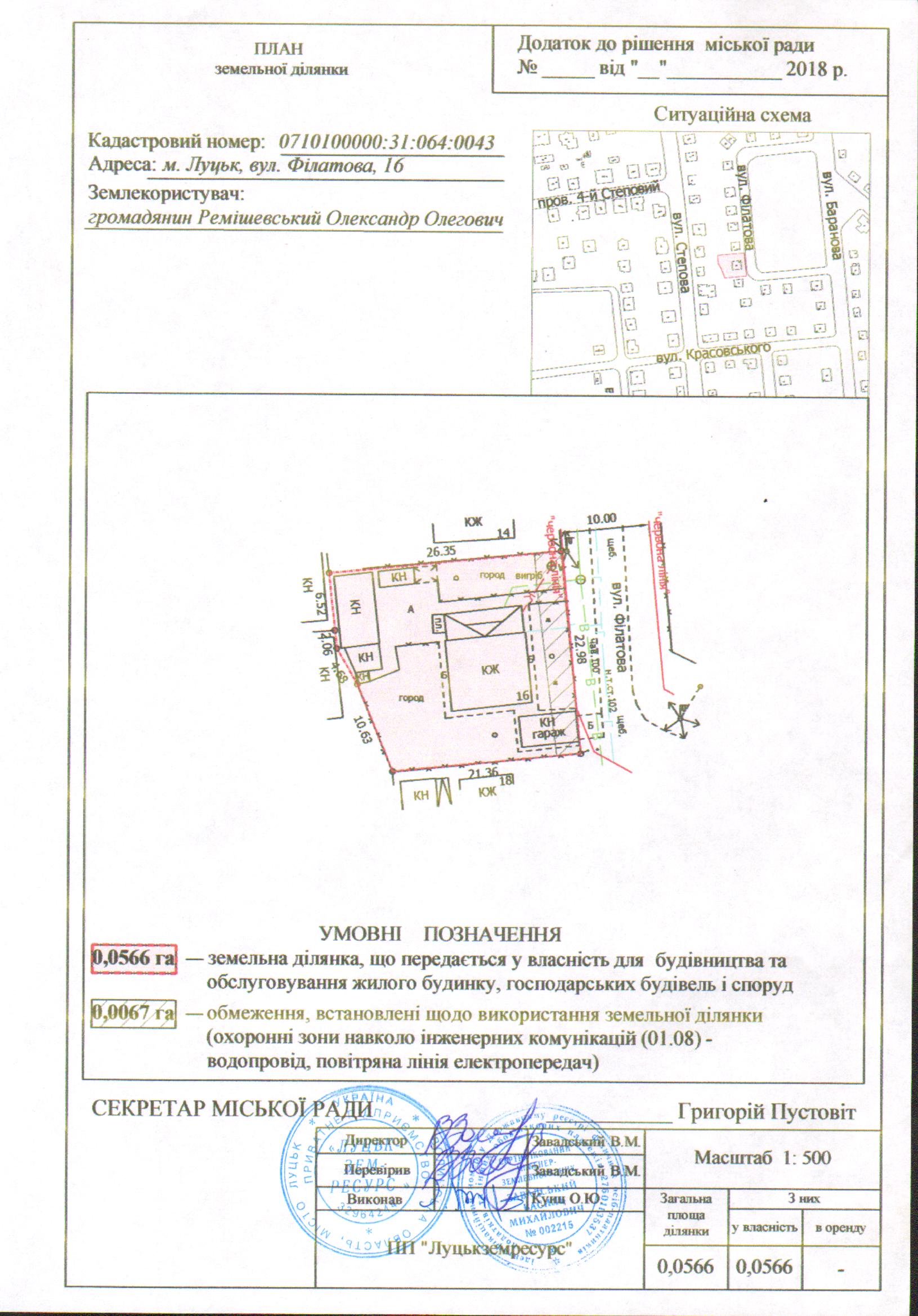 2. Передати громадянину Ремішевському Олександру Олеговичу безоплатно у власність земельну ділянку на вул. Філатова, 16 площею 0,0566 га, кадастровим номером 0710100000:31:064:0043 для будівництва та обслуговування жилого будинку, господарських будівель і споруд, згідно з додатком.