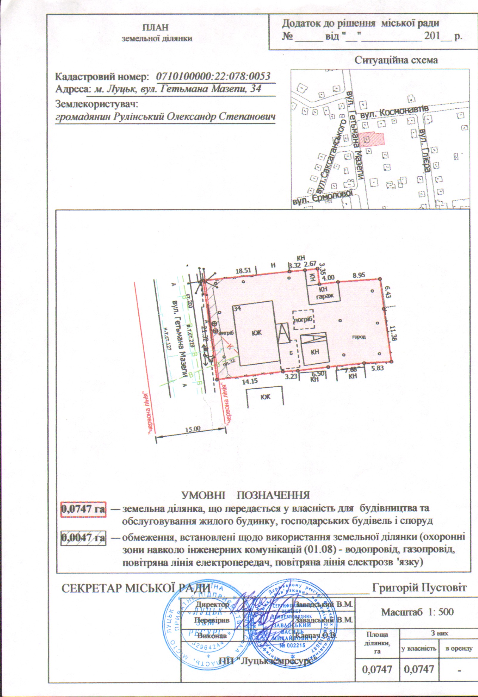 2. Передати громадянину Рулінському Олександру Степановичу безоплатно у власність земельну ділянку на вул. Гетьмана Мазепи, 34 площею 0,0747 га, кадастровим номером 0710100000:22:078:0053 для будівництва та обслуговування жилого будинку, господарських будівель і споруд, згідно з додатком.