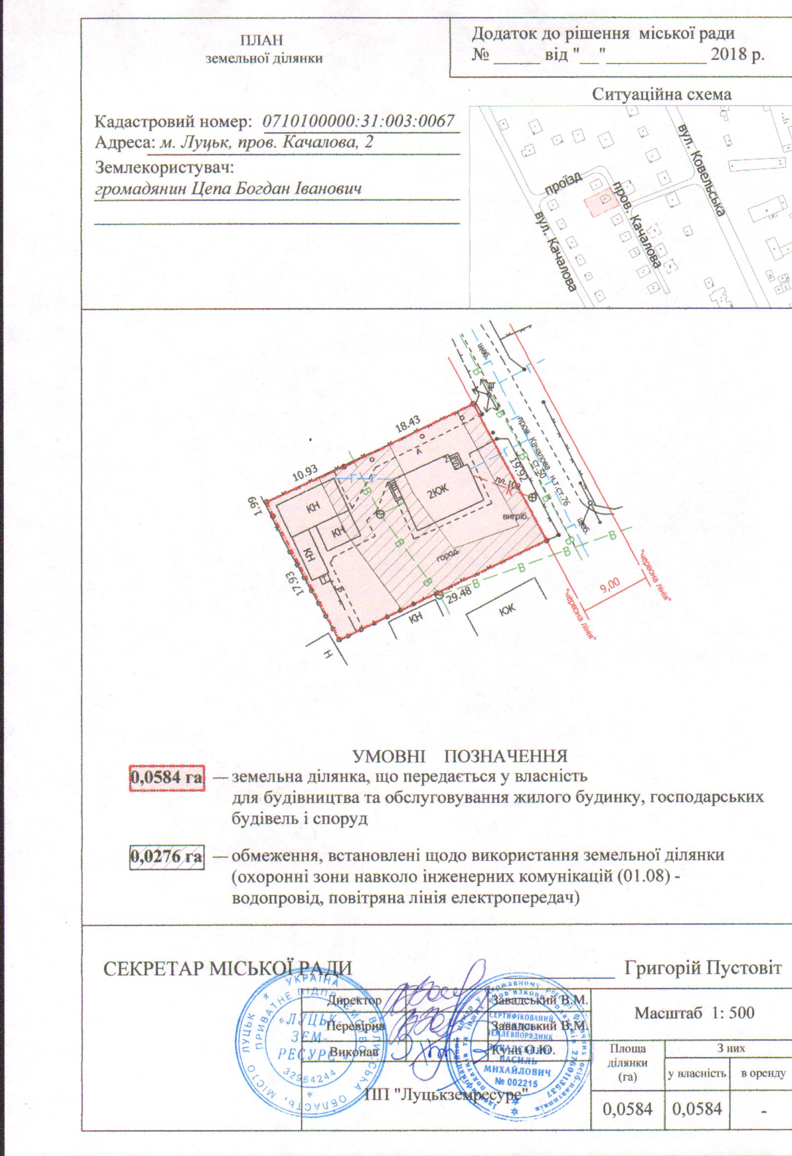 2. Передати громадянину Цепі Богдану Івановичу безоплатно у власність земельну ділянку на пров. Качалова, 2 площею 0,0584 га, кадастровим номером 0710100000:31:003:0067 для будівництва та обслуговування жилого будинку, господарських будівель і споруд, згідно з додатком.