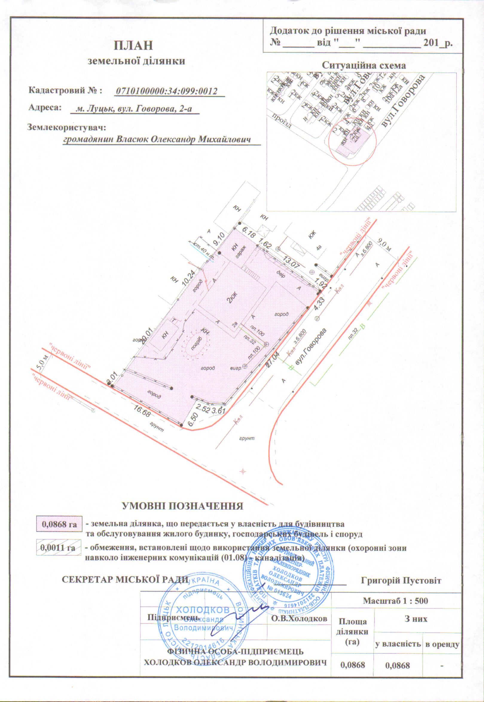 2. Передати громадянину Власюку Олександру Михайловичу безоплатно у власність земельну ділянку на вул. Говорова, 2-а площею 0,0868 га, кадастровим номером 0710100000:34:099:0012 для будівництва та обслуговування жилого будинку, господарських будівель і споруд, згідно з додатком.