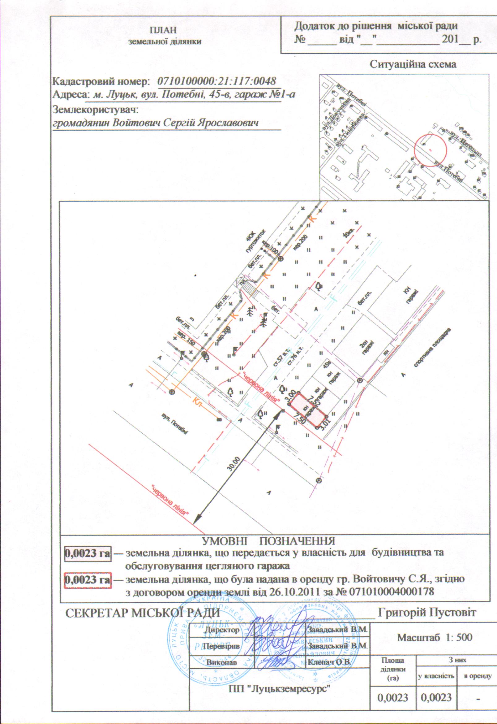 2. Передати громадянину Войтовичу Сергію Ярославовичу безоплатно у власність земельну ділянку на вул. Потебні, 45-в, гараж №1-а площею 0,0023 га, кадастровим номером 0710100000:21:117:0048 для будівництва та обслуговування цегляного гаража, згідно з додатком.